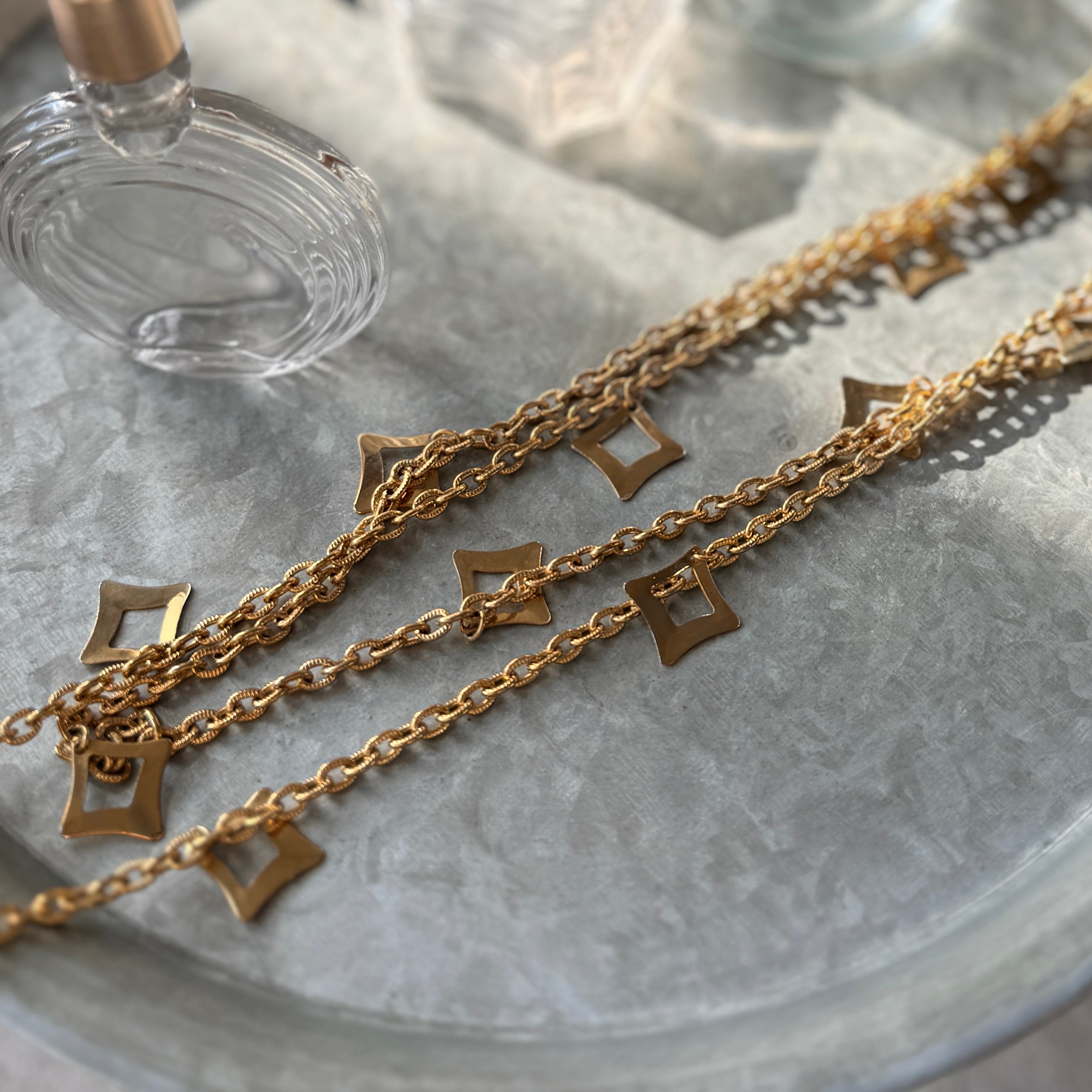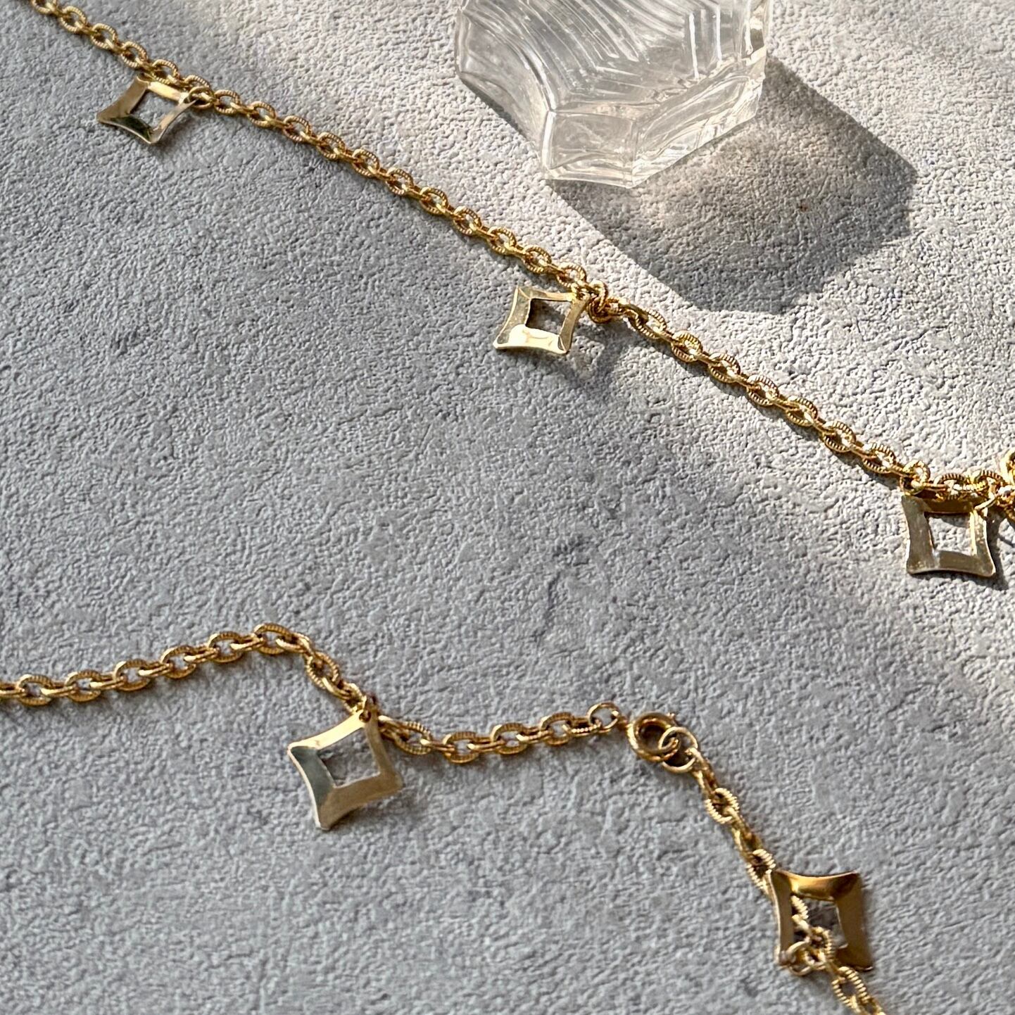 ジオメトリックなオープンワークチャームを等間隔に配置したステーションネックレス。