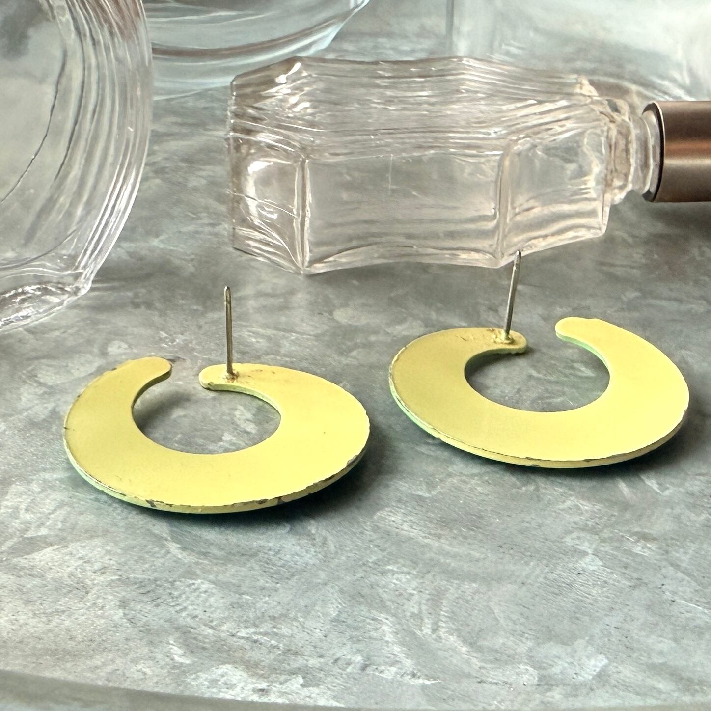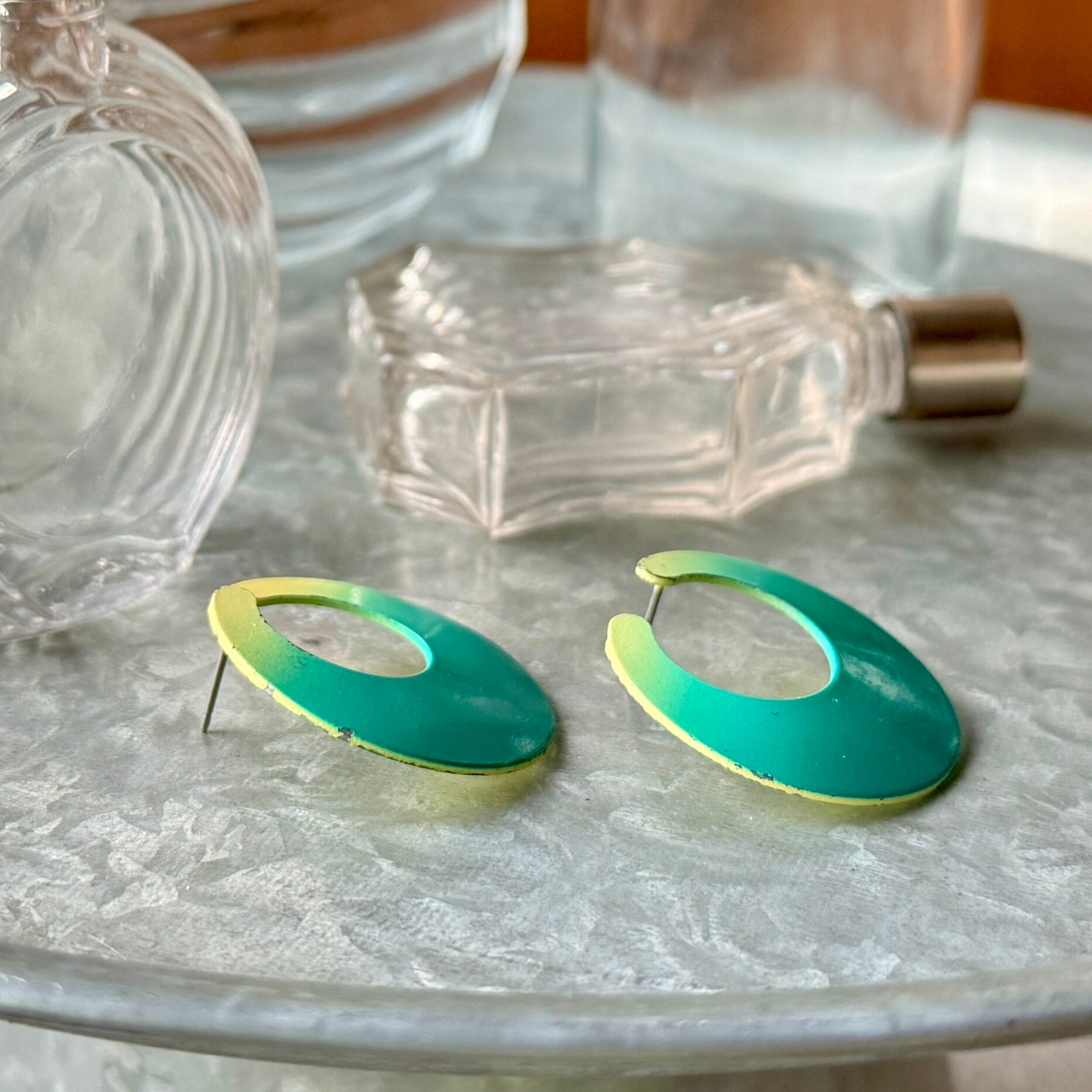 PA484-【 AVON 】エイボン・ヴィンテージピアス 1987 Green-Yellow Enamel Paint Gradient Crescent Hoop Post Earrings