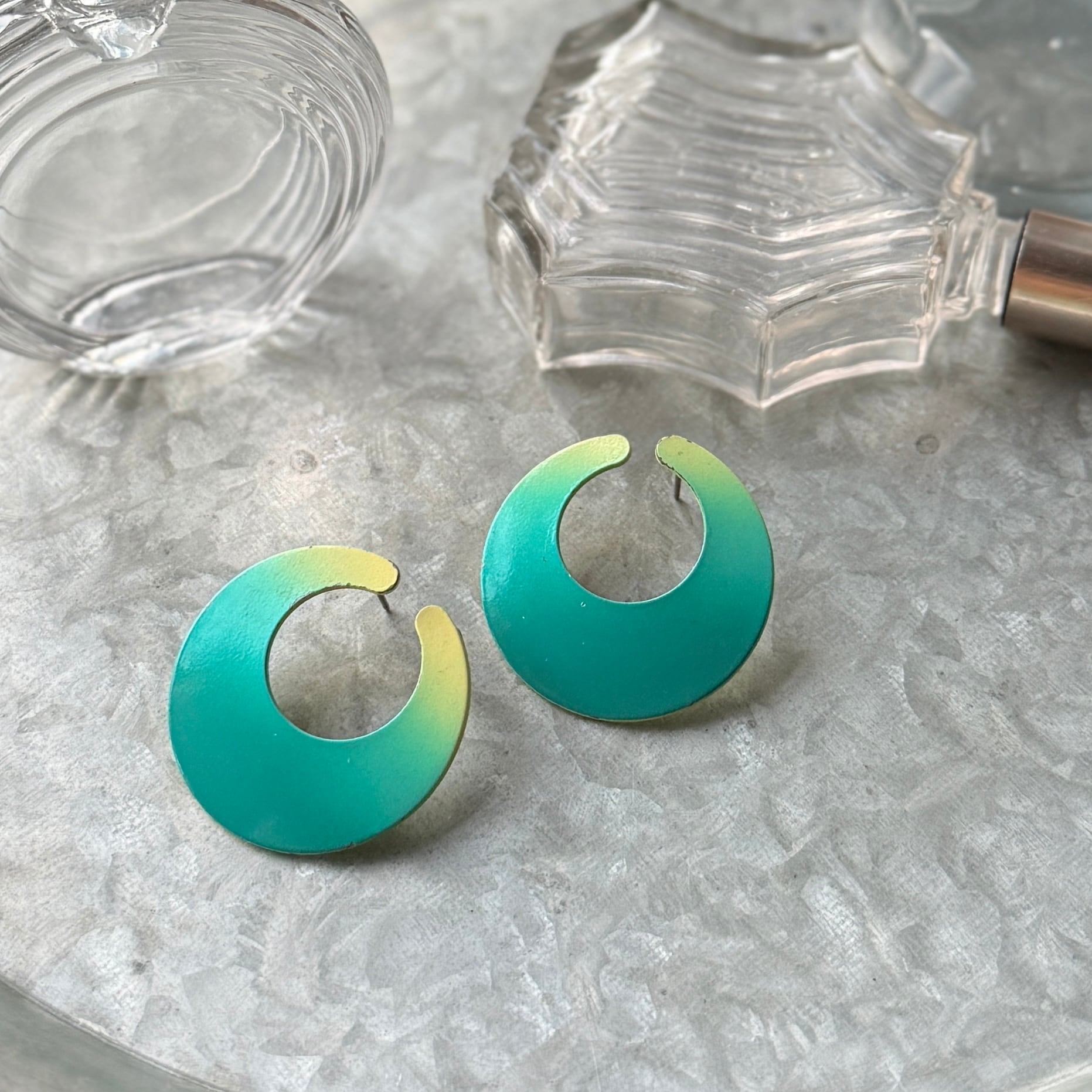 鮮やかなエメラルドグリーンとイエローのグラデーションが目を引くクレセントフープピアス。