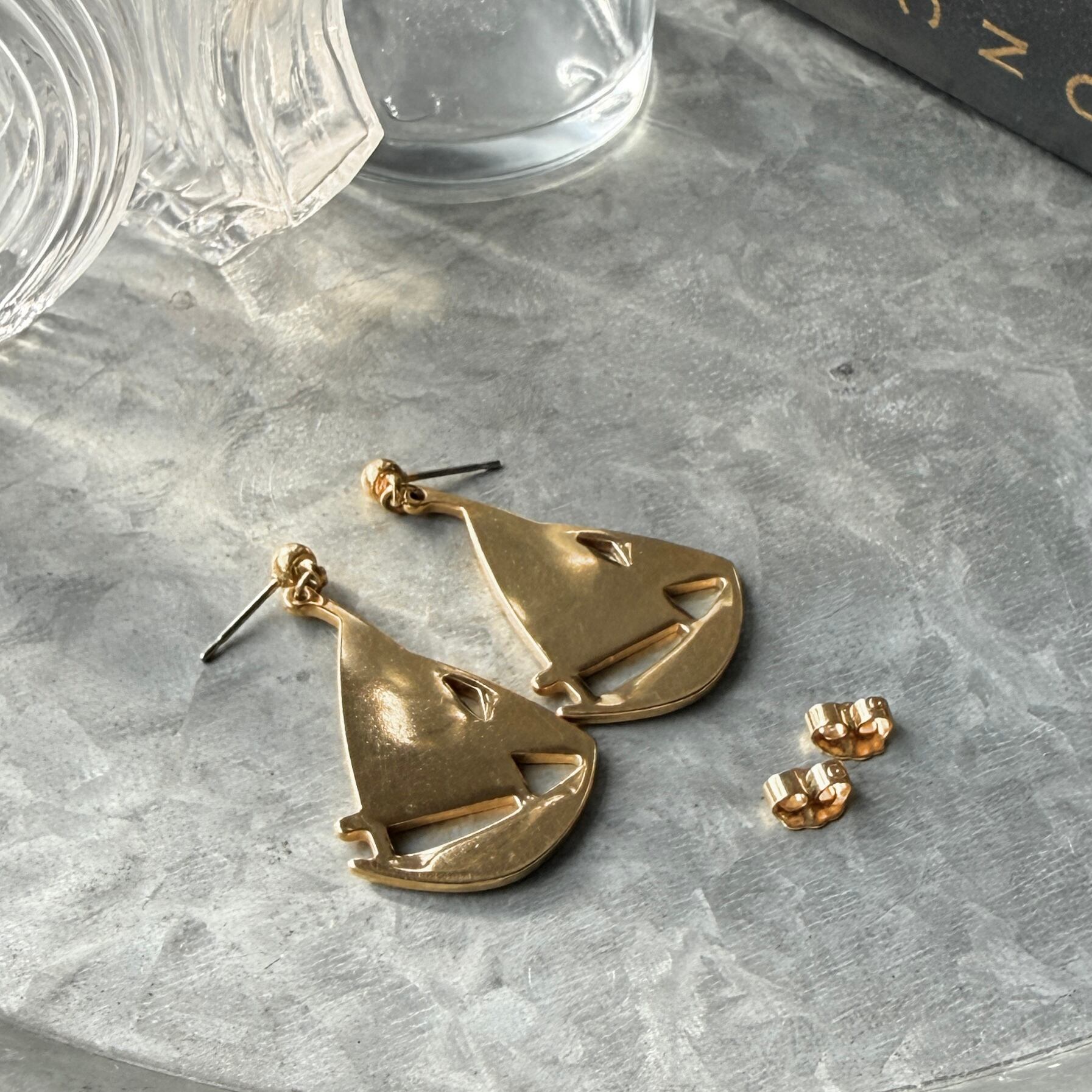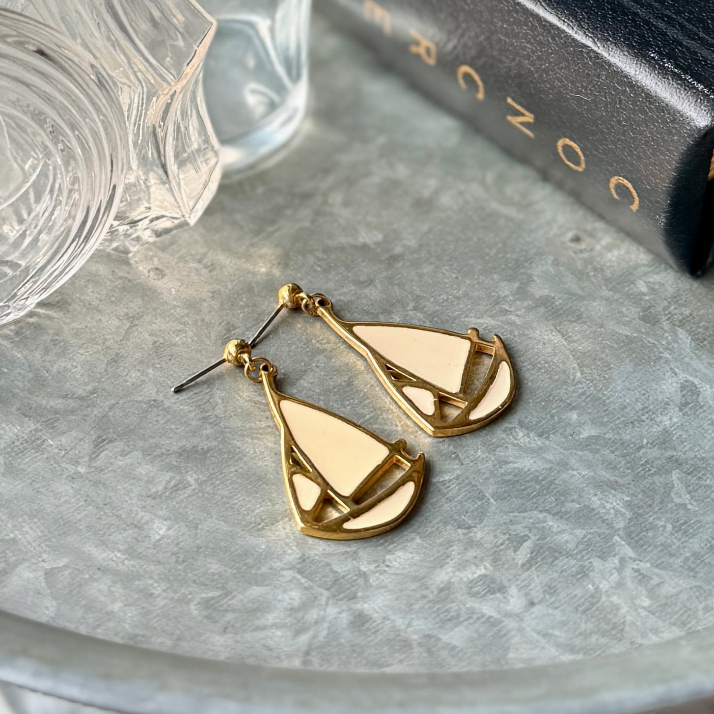 ゴールドトーンをベースにクリームエナメルペイントされた、帆船をモチーフにしたダングルピアス。
