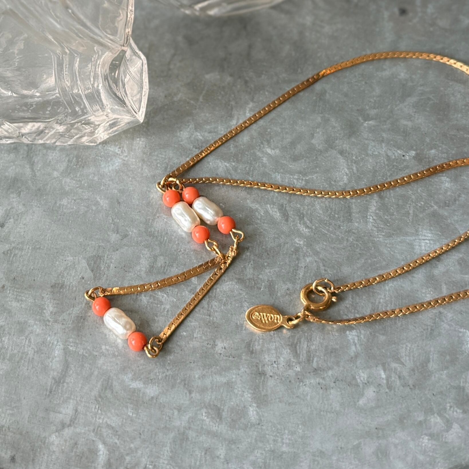 NA158-【 AVON 】エイボン・ヴィンテージネックレス 1981 "Sea Treasure" Gold Tone Chain Necklece with Simulated Pearl and Coral Color Beads