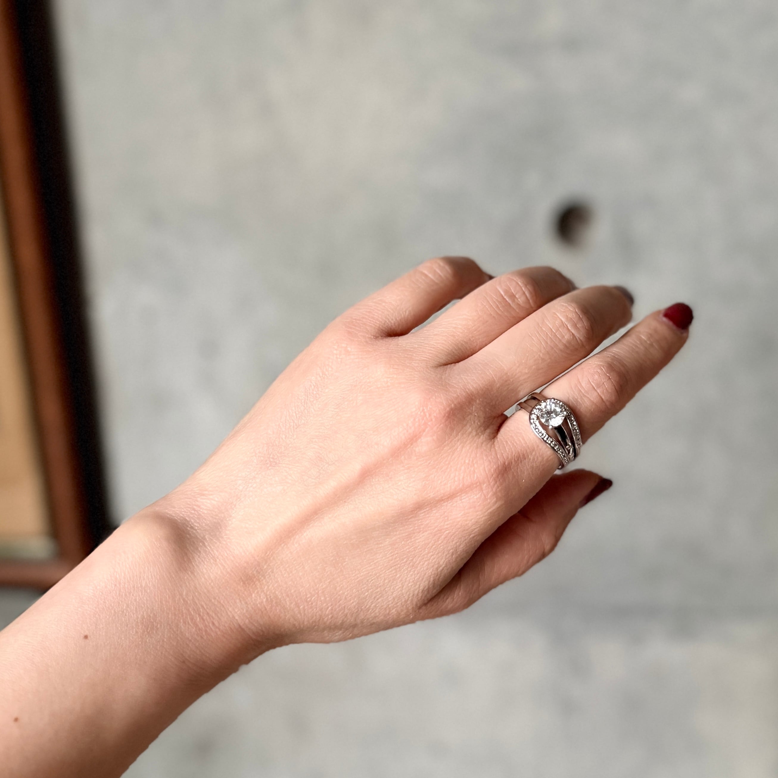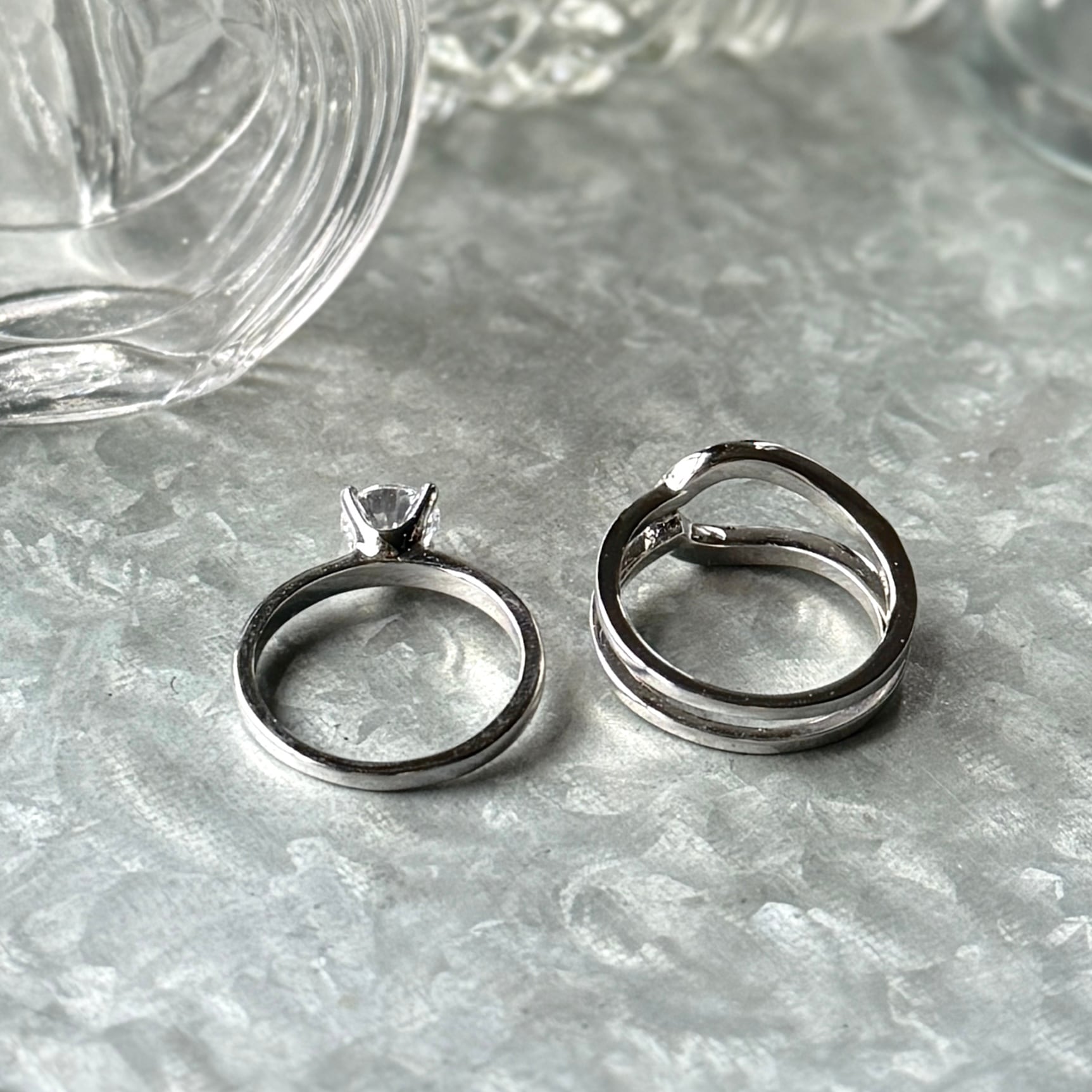 キュービックジルコニアが美しいリングと、マーカサイトのような凹凸感のあるテクスチャーのウェーブ状ガードリングの2本セットです。