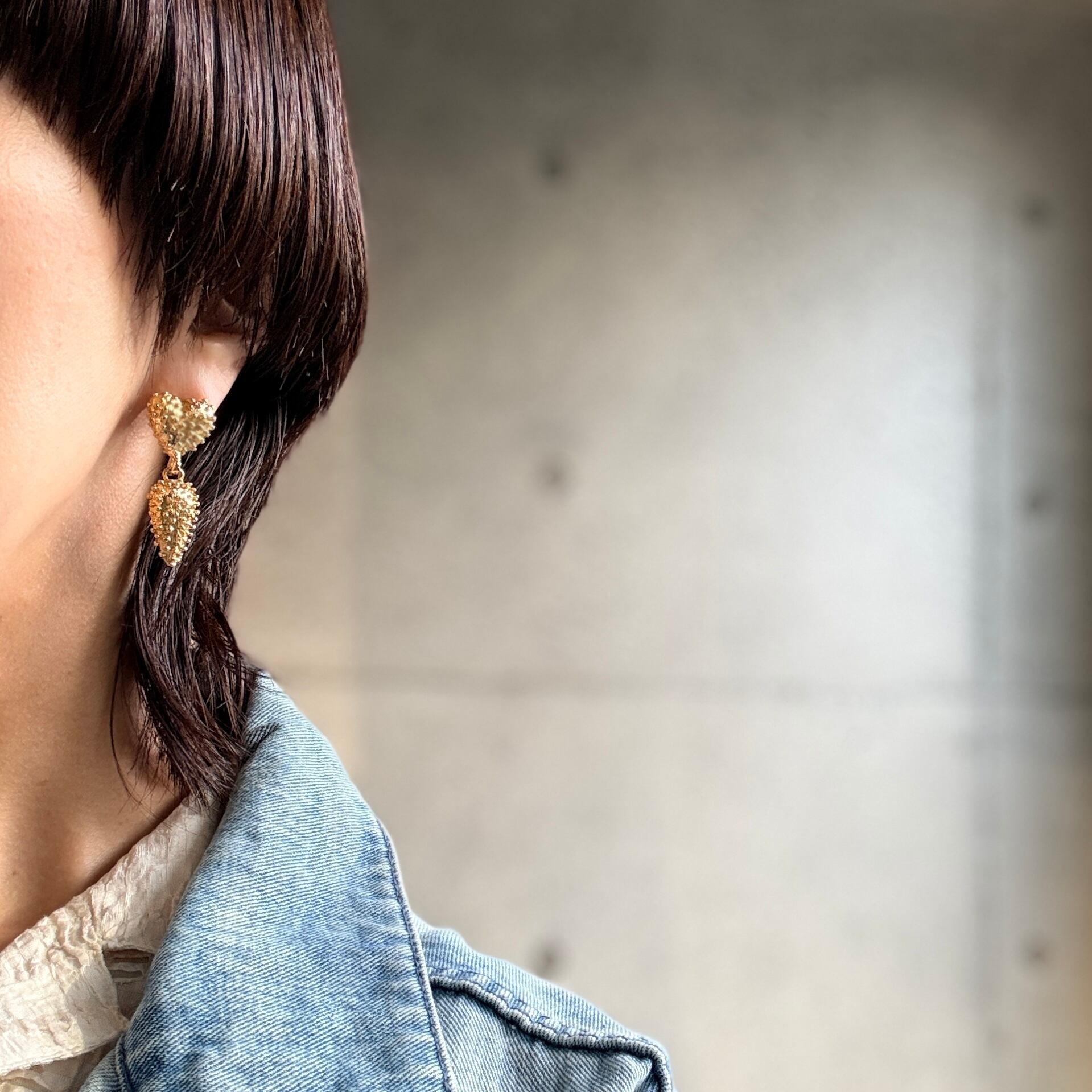 ゴールドトーンのハートモチーフに、大粒のティアードロップが揺れる華やかなデザイン。