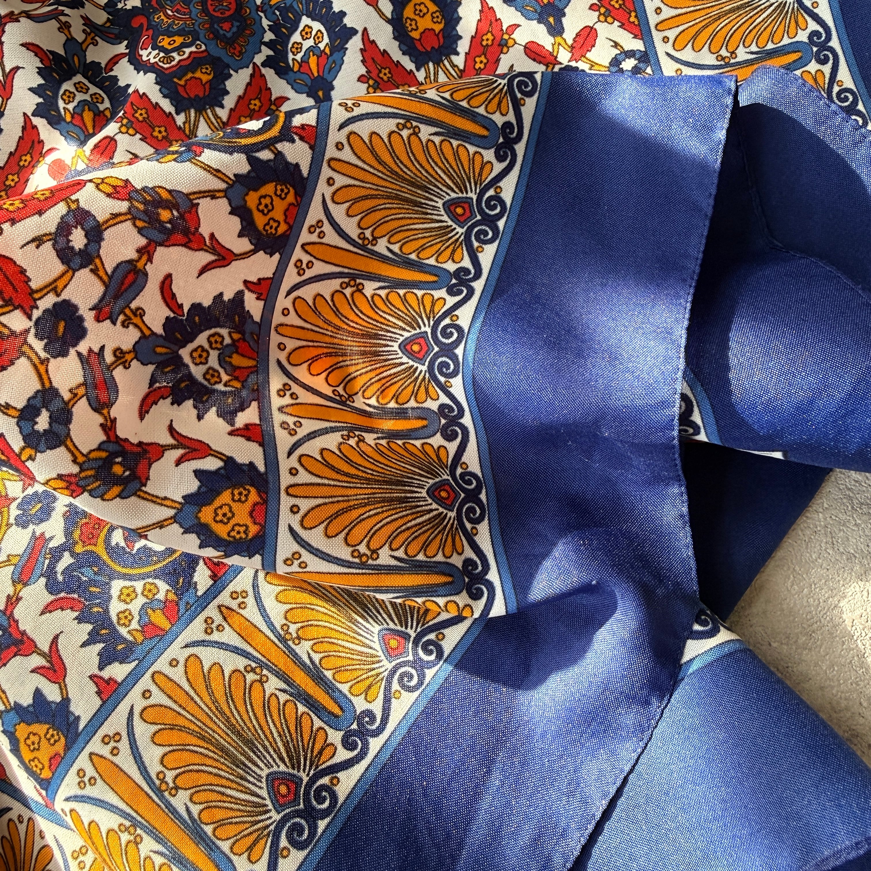 落ち着きのあるネイビーを基調に、華やかなペイズリーとボタニカル模様が描かれた、上品でありながらエキゾチックな一枚。