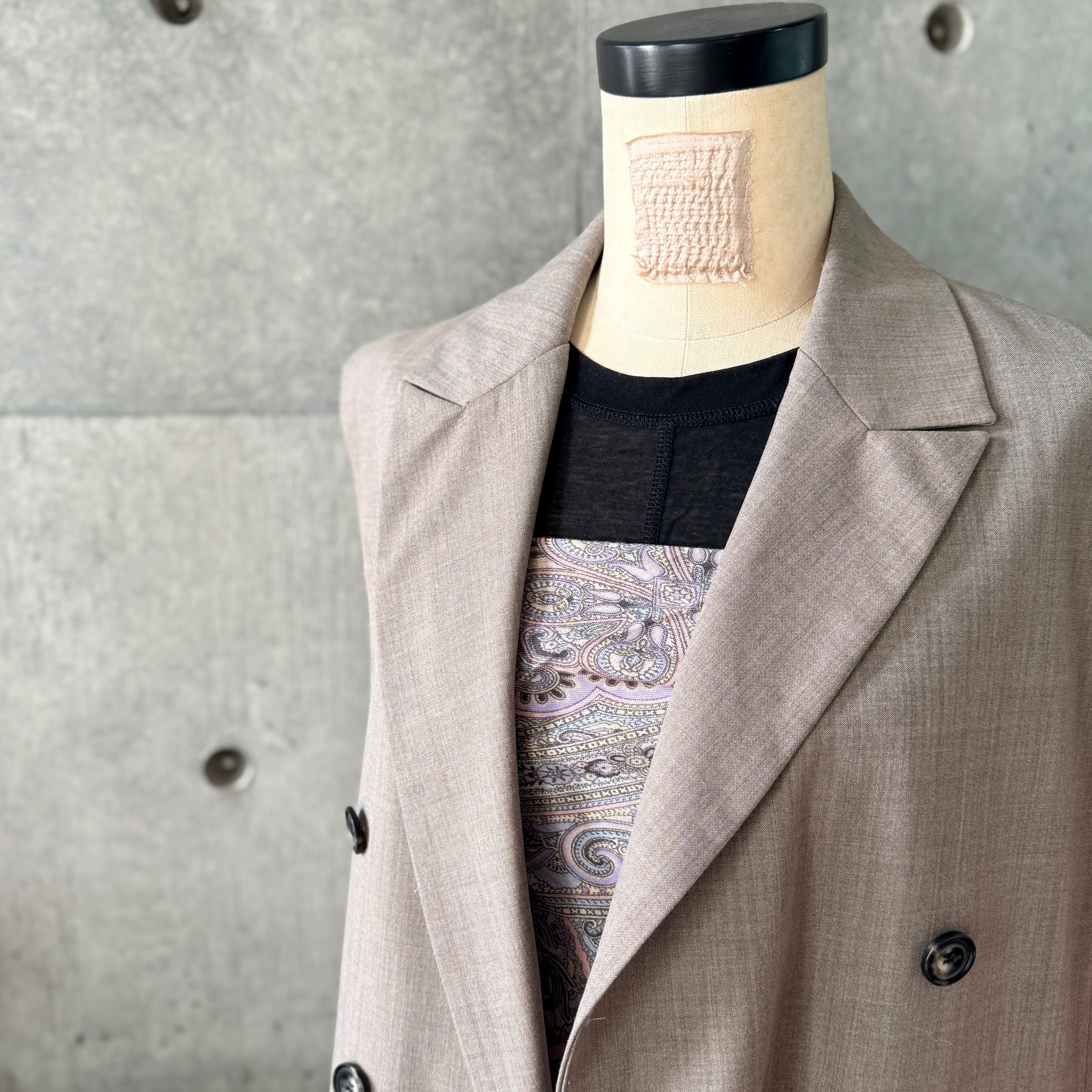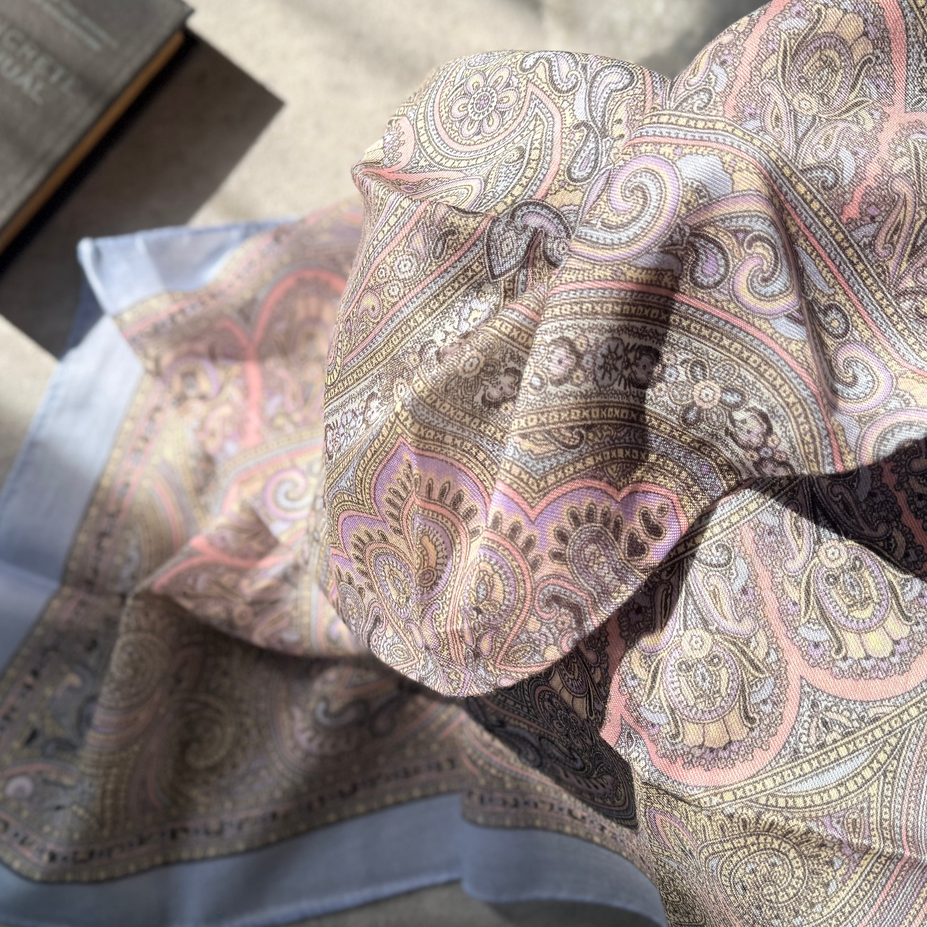 サックスブルーをベースに、淡いピンク、イエロー、チャコールで大胆に描かれたペイズリープリントスカーフ。