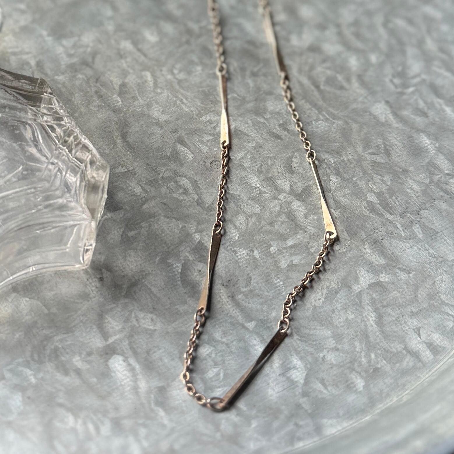 ゴールドトーンのバー&リンクチェーンネックレス。規則的に並んだストレートバーと、繊細なリンクチェーンの組み合わせデザインが特徴的です。