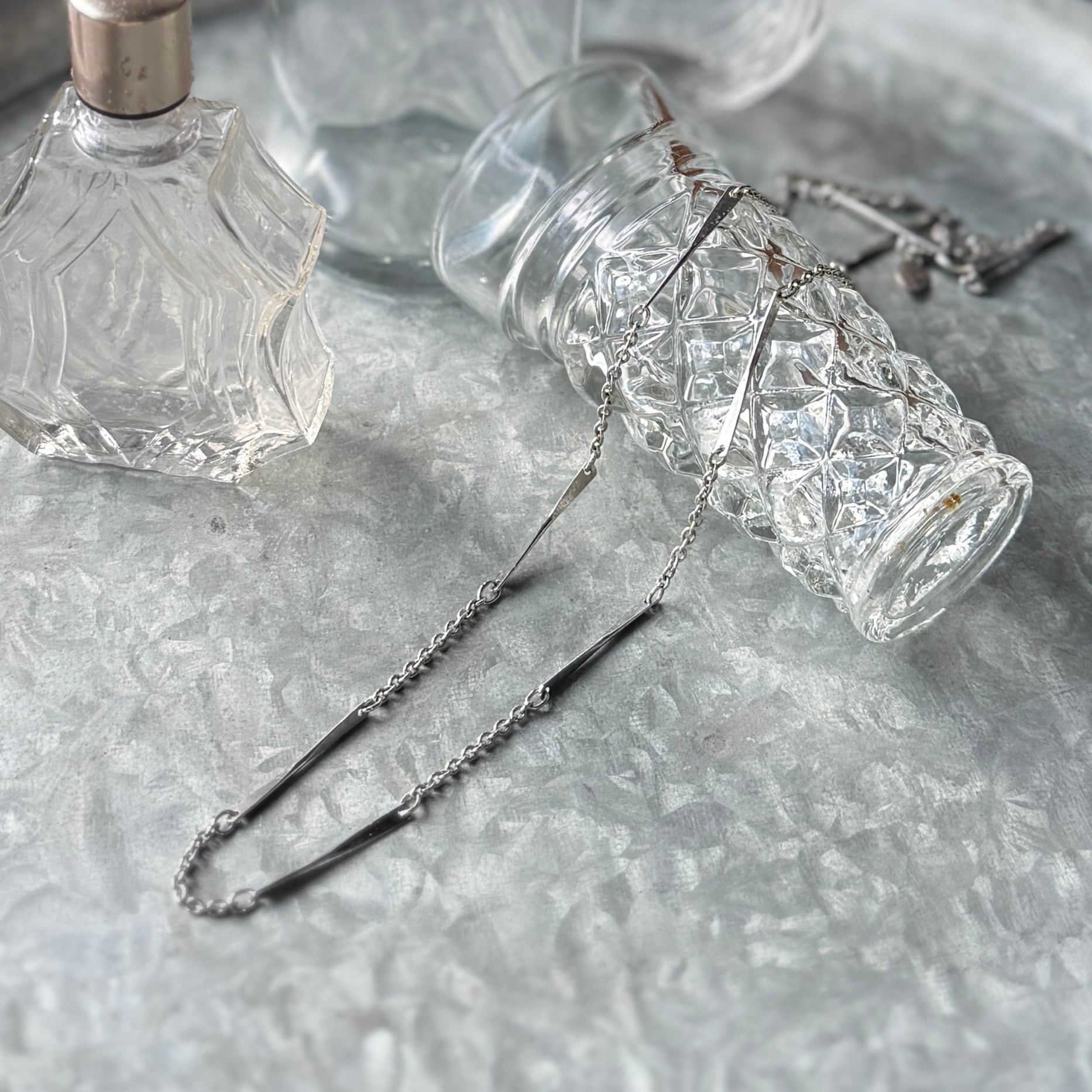 シルバートーンのバー&リンクチェーンネックレス。規則的に並んだストレートバーと、繊細なリンクチェーンの組み合わせデザインが特徴的です。