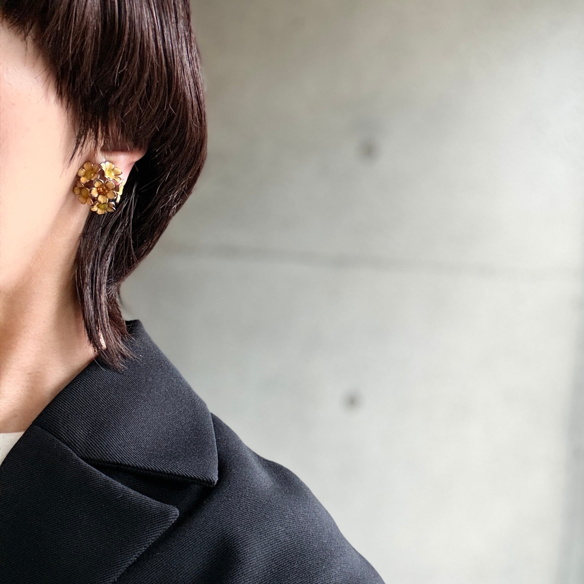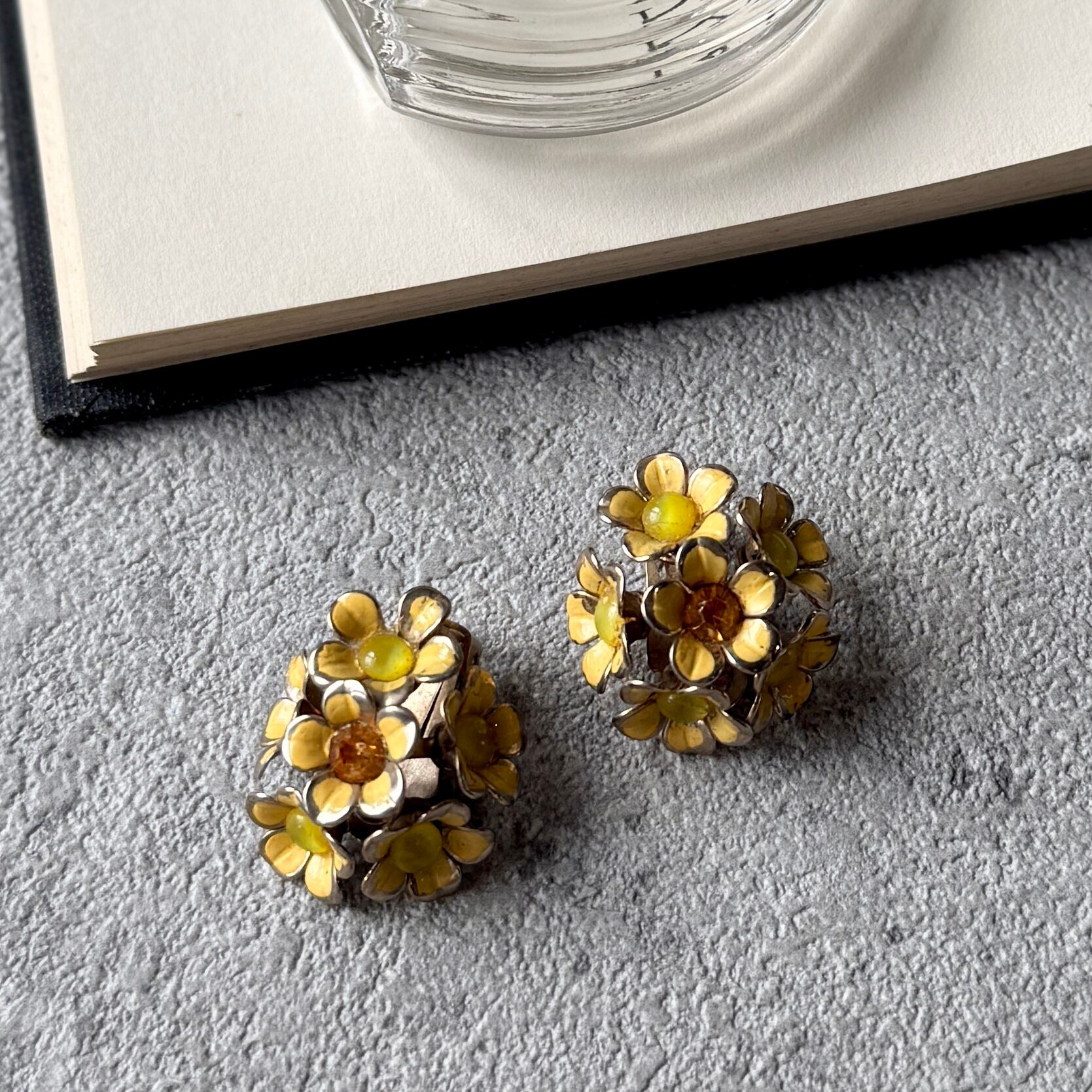 イエローフラワーの立体感のあるクラスターデザインイヤリング。