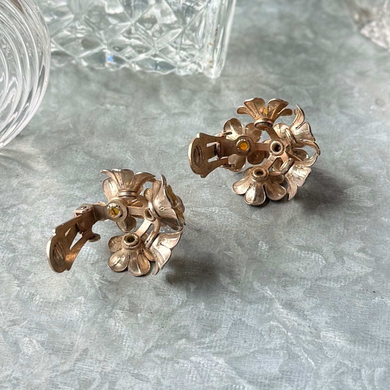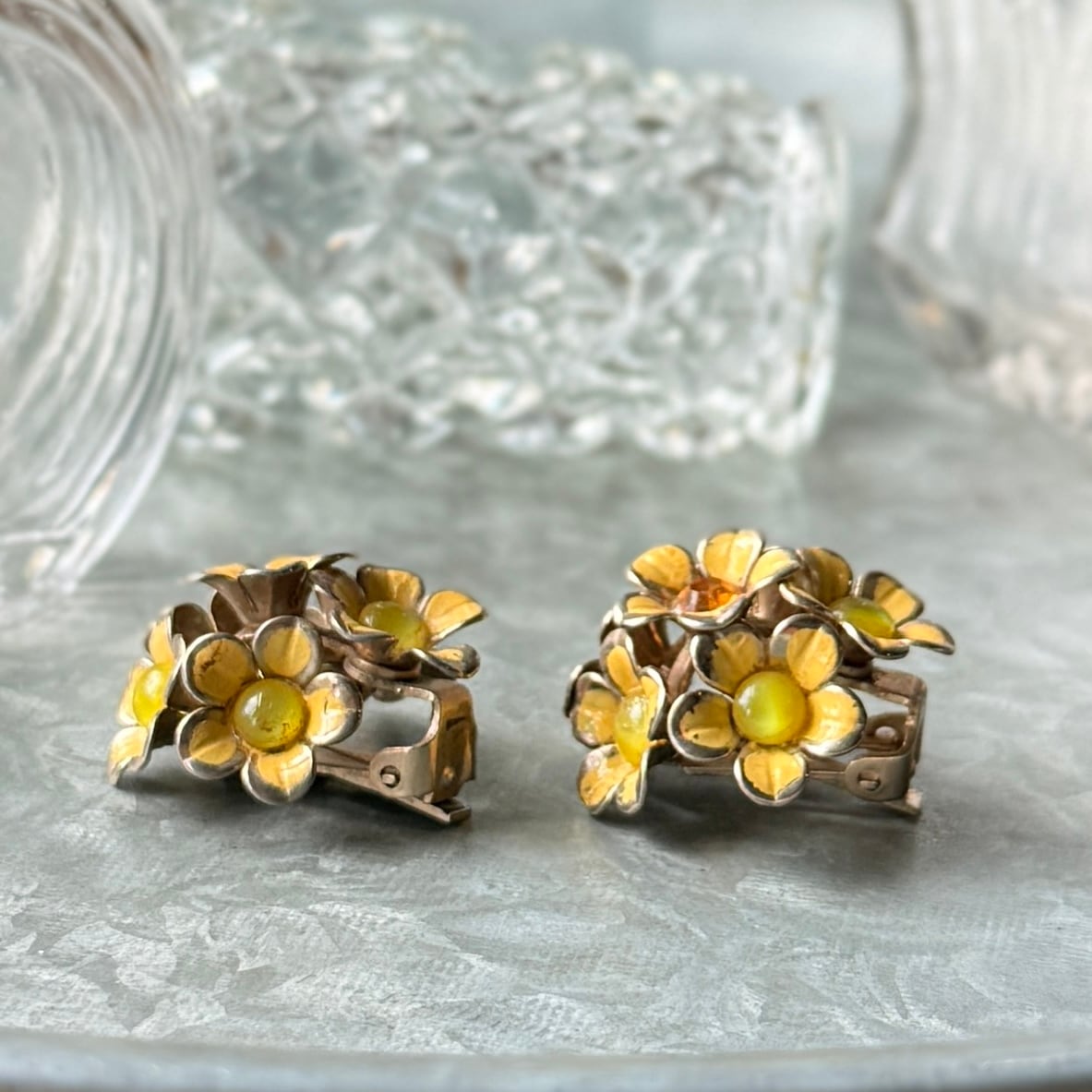 Y1238-ヴィンテージイヤリング U.S.A. 1950-60's Yellow Flower Cluster Citrine Amber Rhinestone Clip Earrings