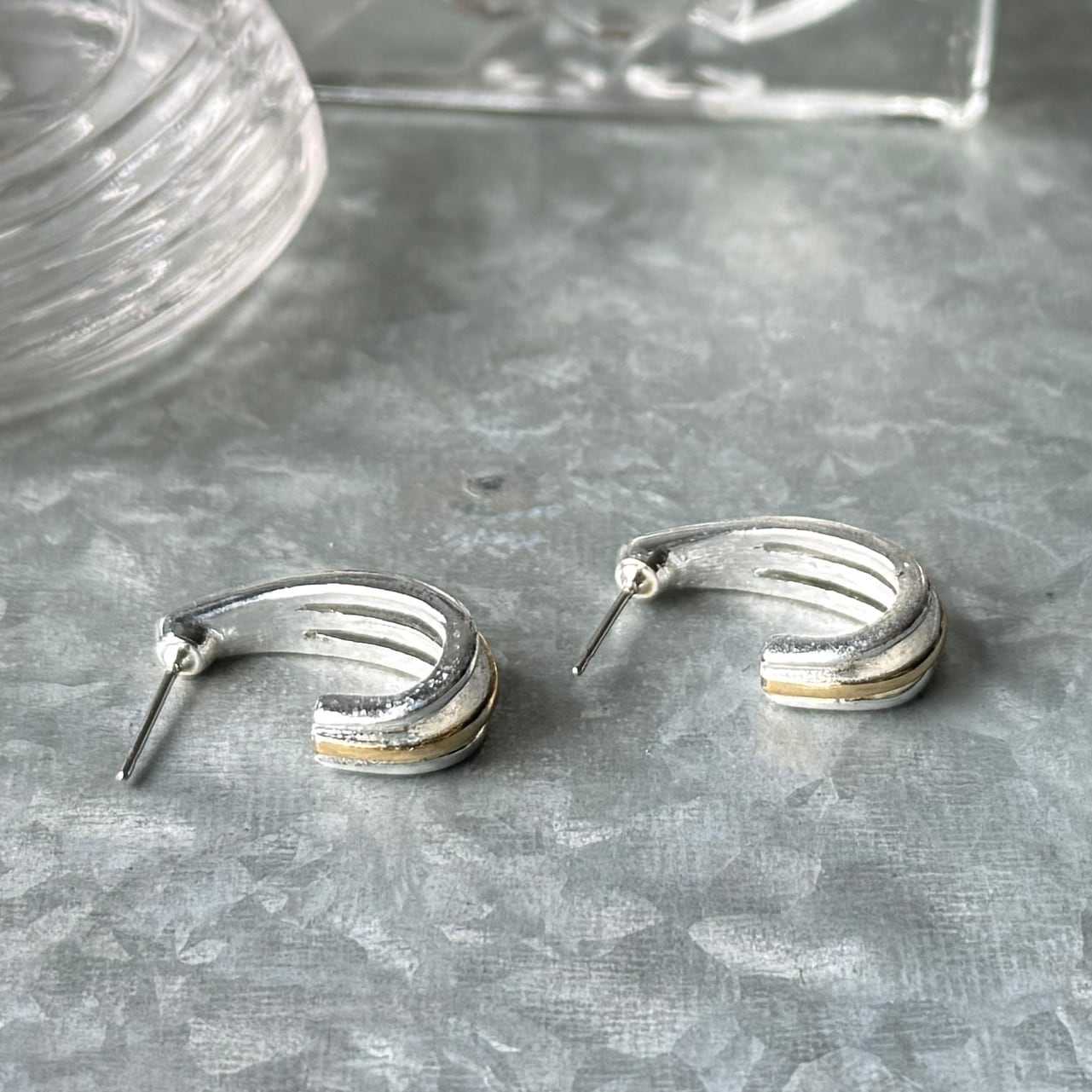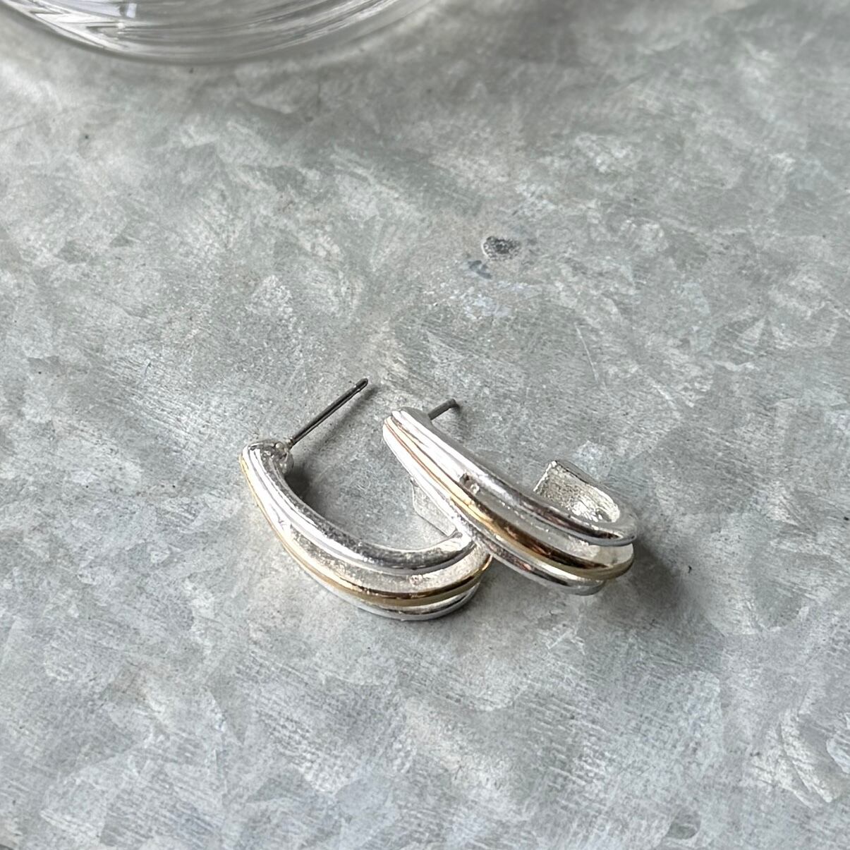 シルバートーンをベースにゴールドラインがアクセントになったハーフフープピアス。