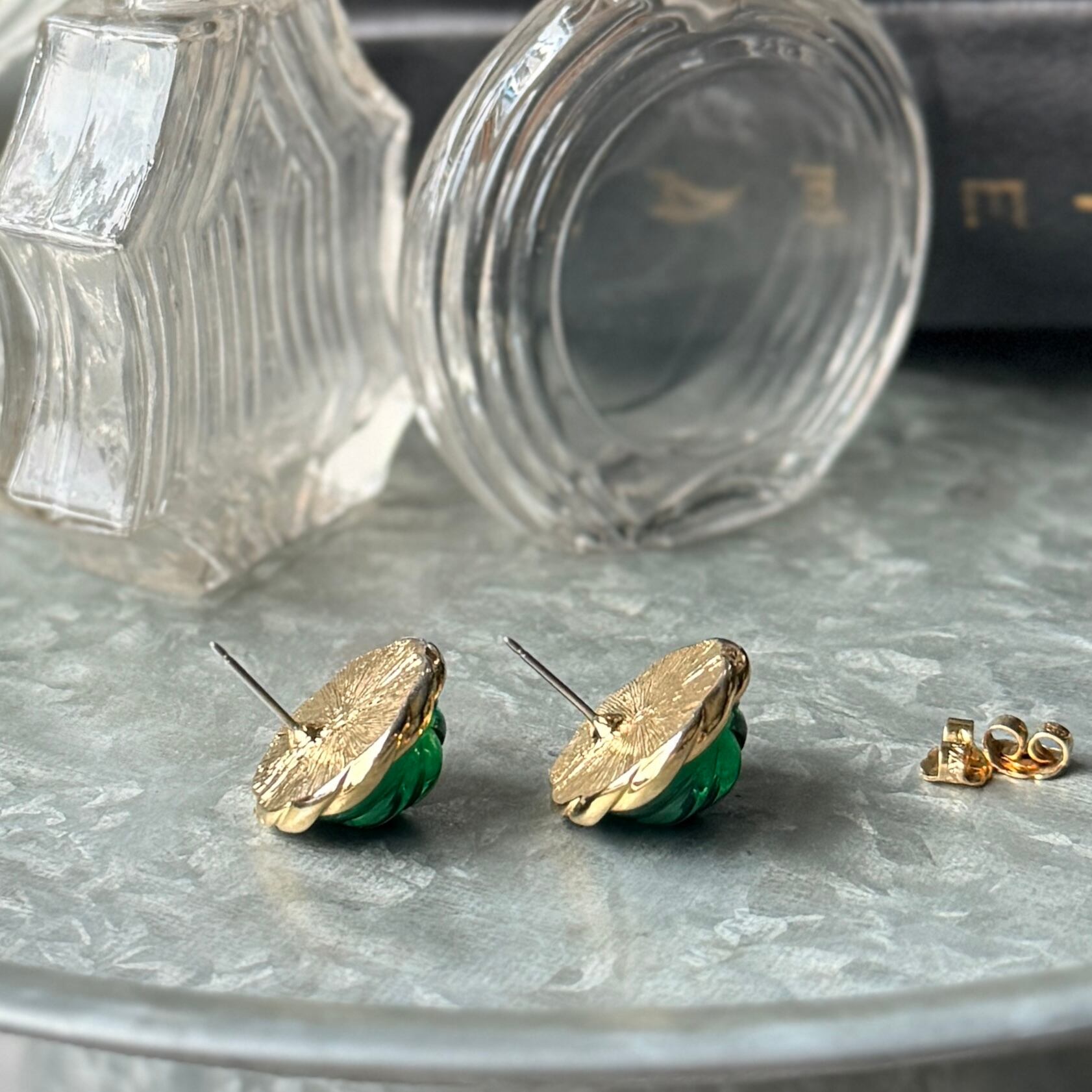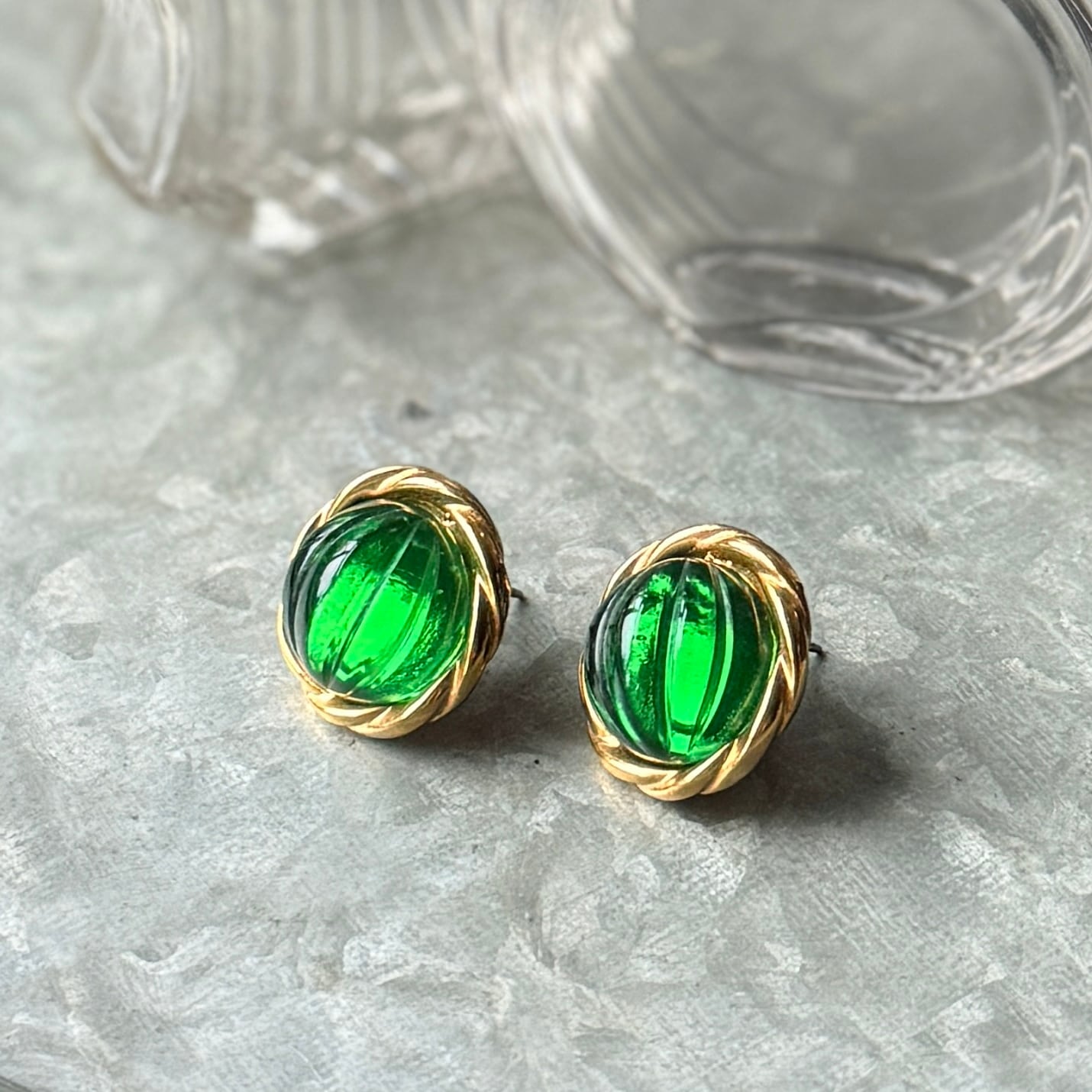 PA503-【 AVON 】エイボン・ヴィンテージピアス 1980's Forest Green Melon Cut Lucite Gold Tone Pierced Earrings