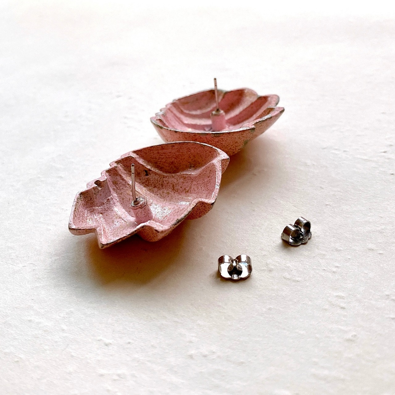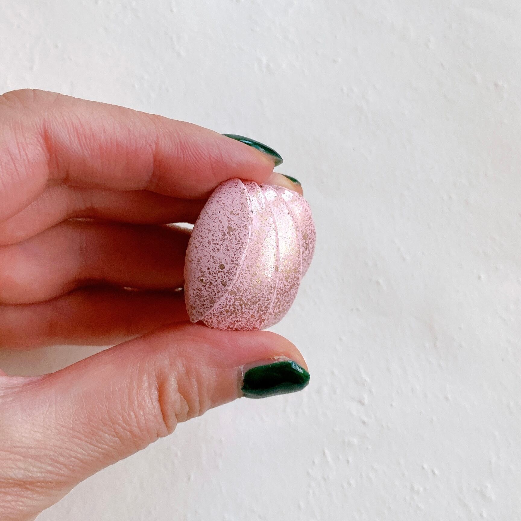 細かなゴールド箔が散りばめられた淡いピンクのエナメルペイント。大ぶりで立体感のあるデザインがレトロで個性的な存在感を放っています。