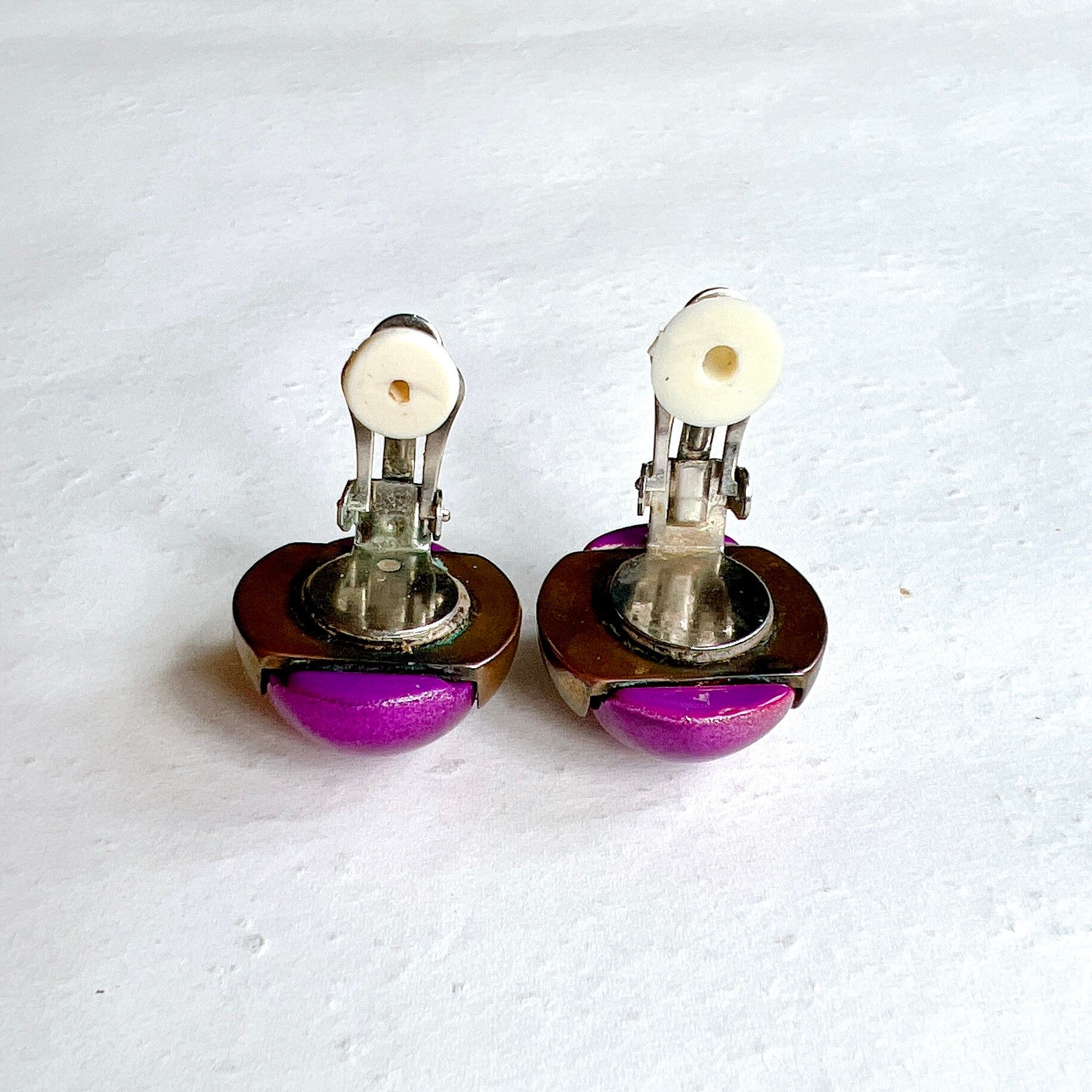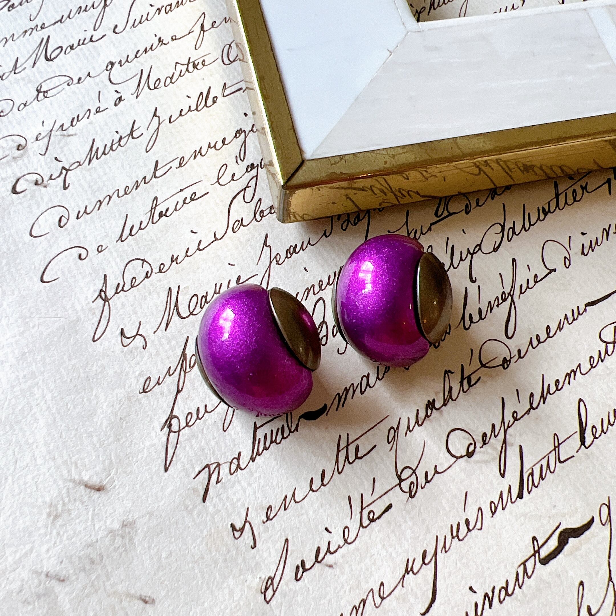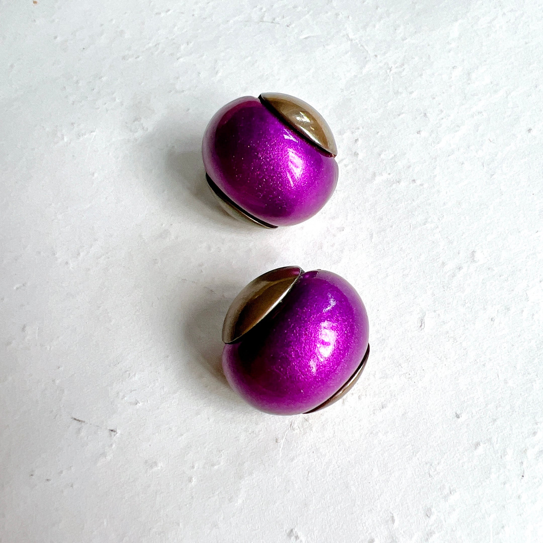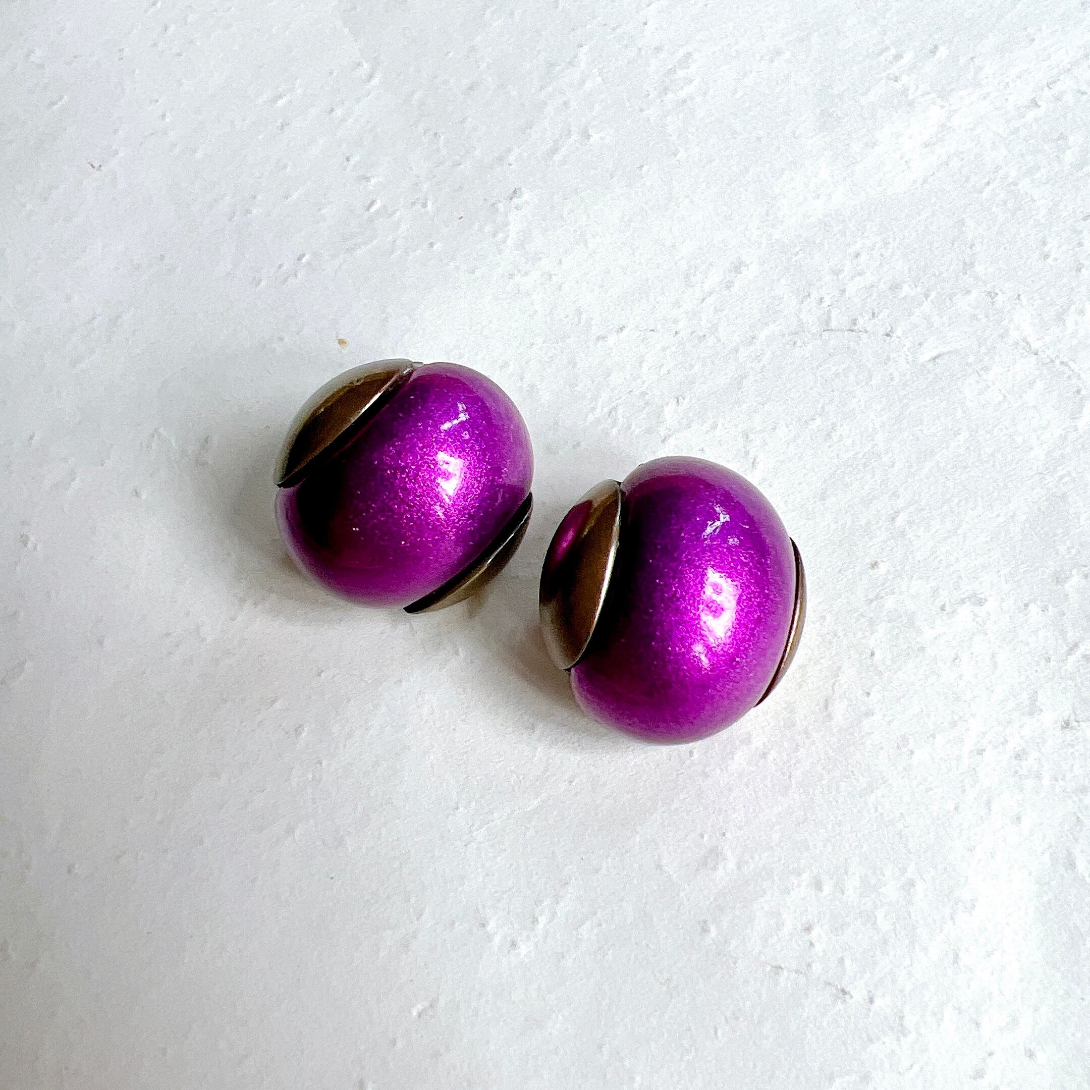 コロンとしたフォルムのメタリックなパープルのカボションイヤリング。ブラウンの樹脂の土台が効いたデザインは、1970〜80sのコズミックなエッセンスを彷彿とさせる個性的な存在感たっぷりです。
