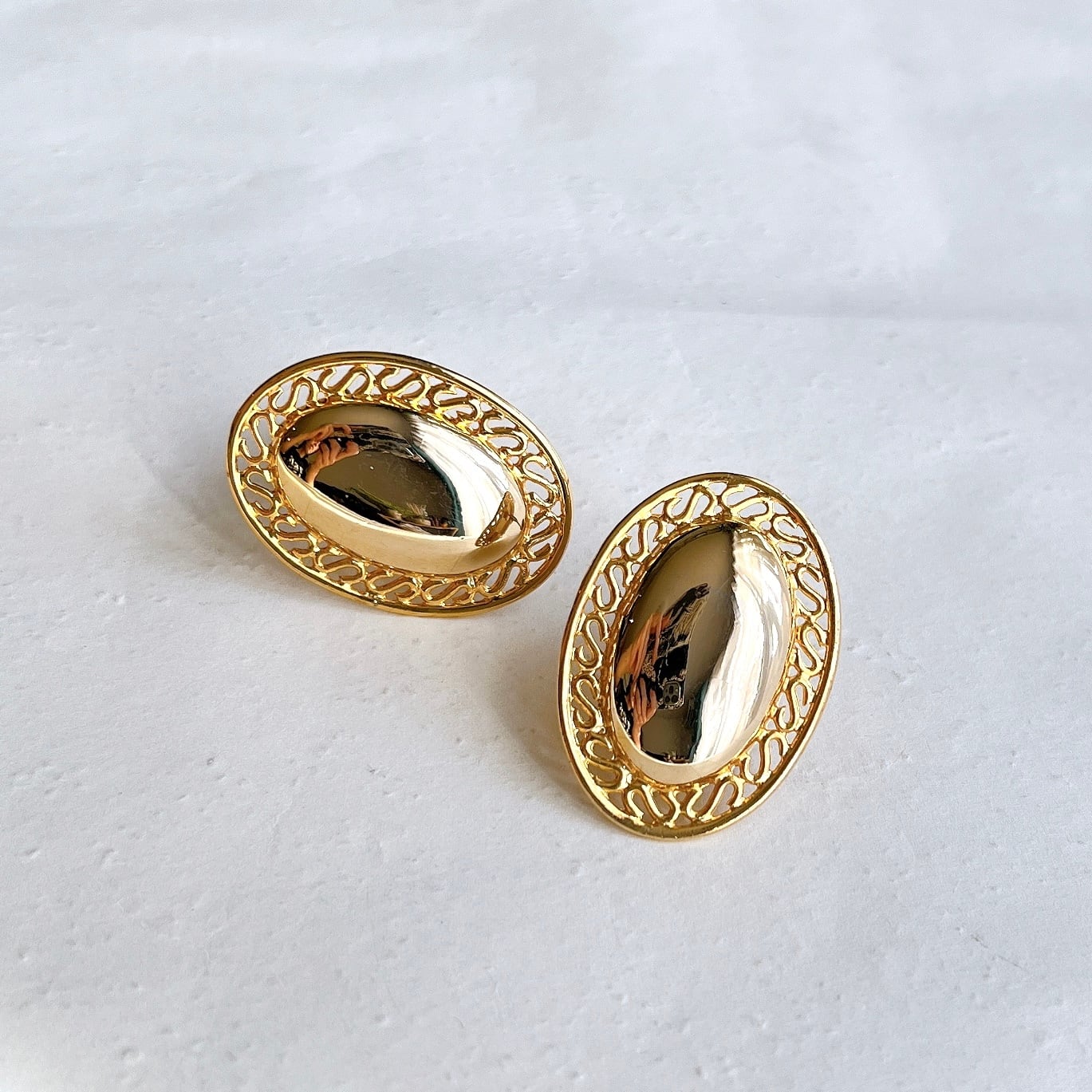 ゴールドトーンのオーバル型の大ぶりイヤリング。まるで鏡のように反射するほど、艶のあるテクスチャー。オープンワークになった縁取りデザイン。