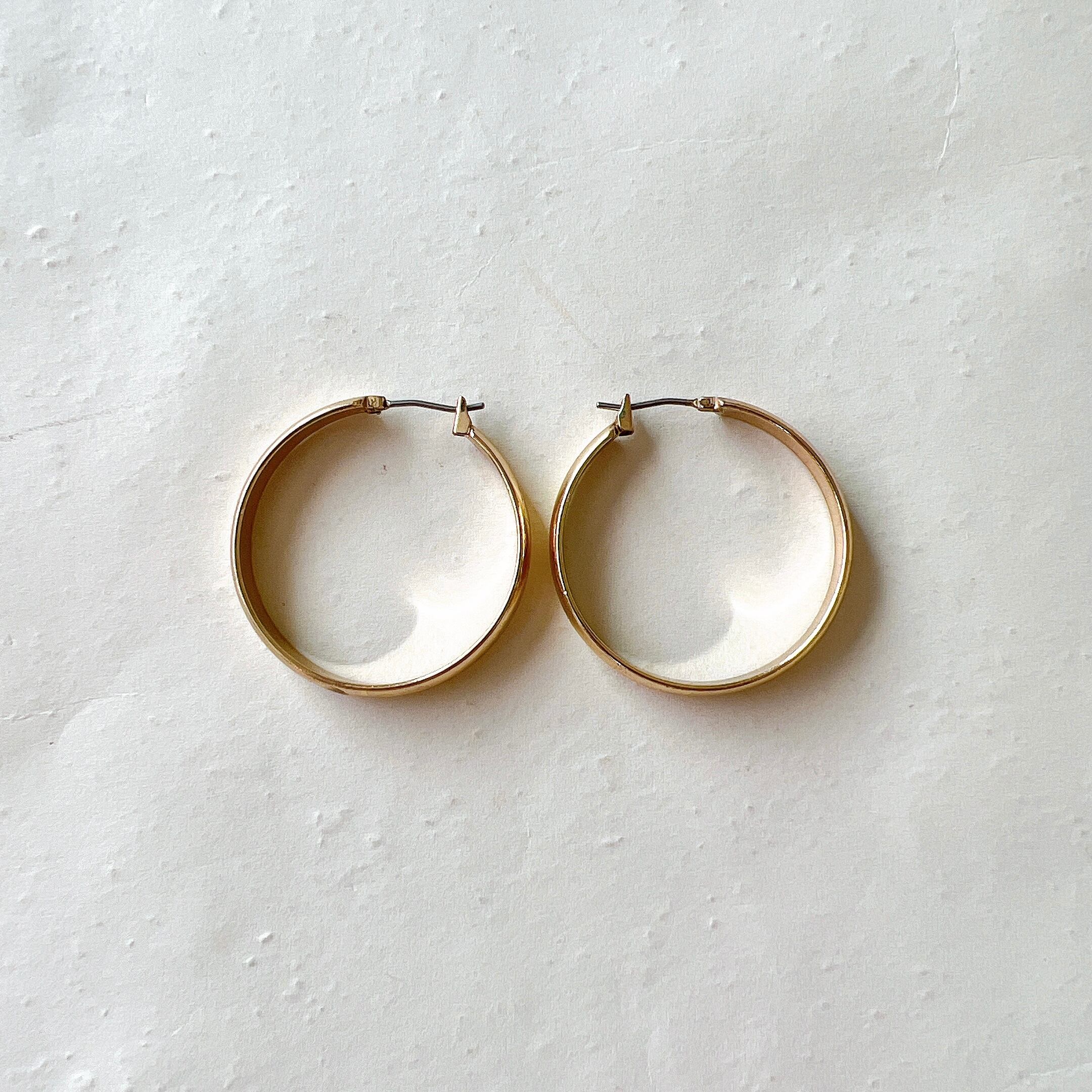 シンプルなデザインのゴールドトーンフープピアス。艶のあるテクスチャーと程よく大きめのサイズ感は、レトロでシャープな印象を与えています。