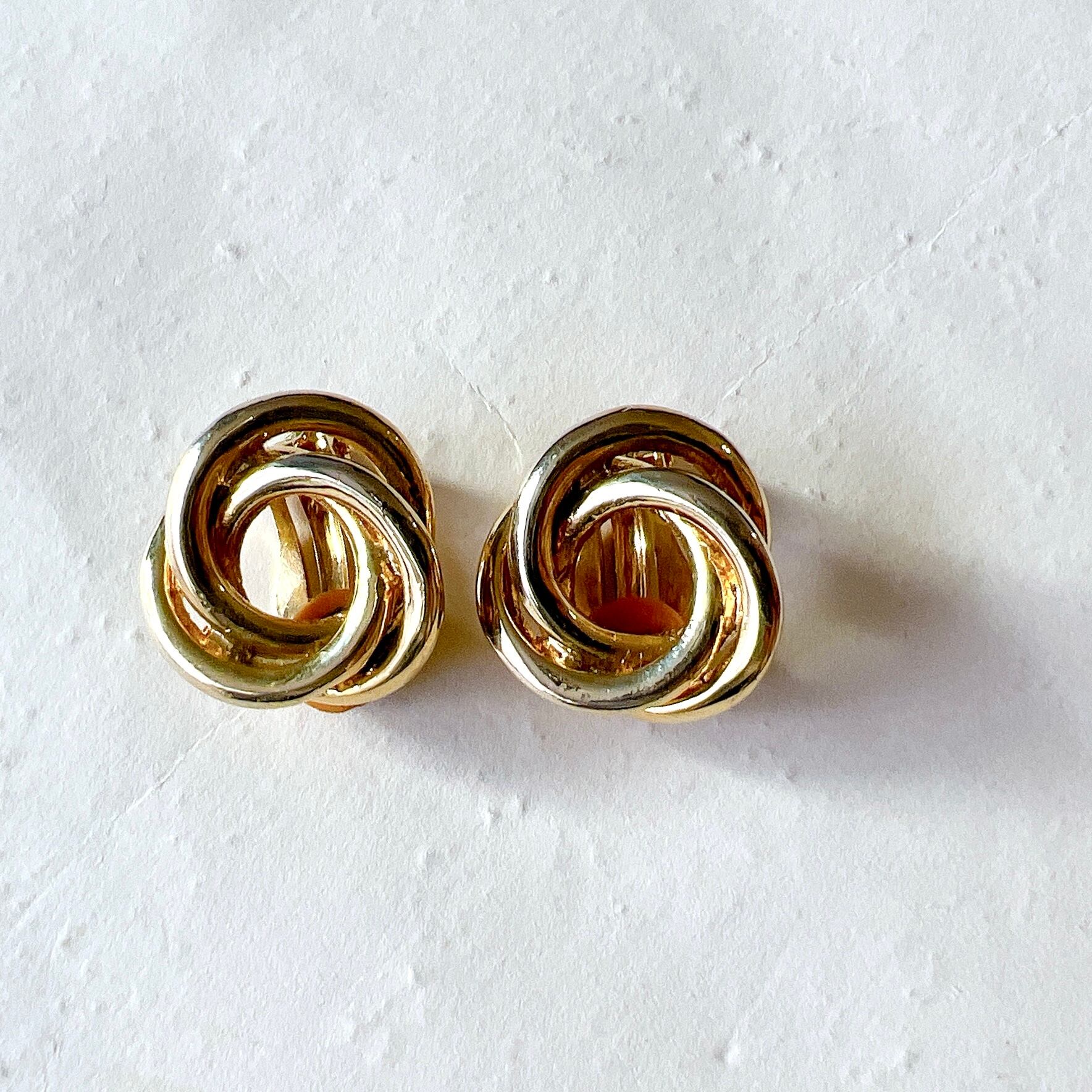 3つのフープが重なり合ったゴールドトーンのクリップイヤリング。艶めくテクスチャーとフープデザインは、レトロでラグジュアリーな印象です。