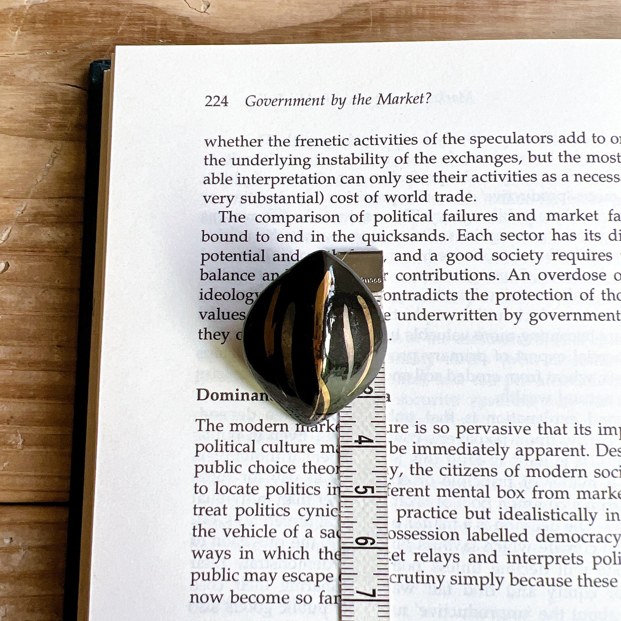 ブラックのエナメルペイントに艶とマットなゴールドの手書きのラインがアクセント。
