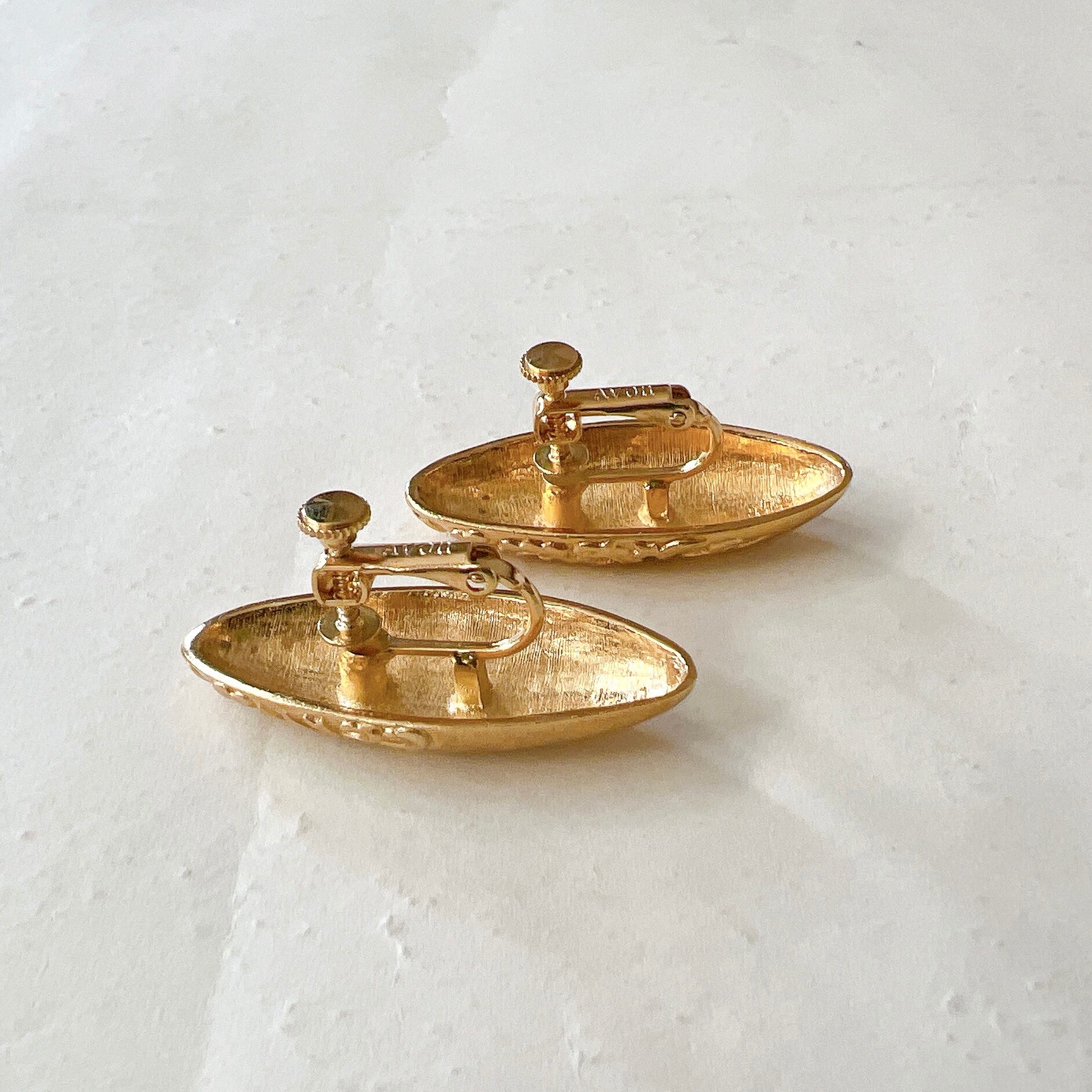 YA43-【 AVON 】エイボン・ヴィンテージイヤリング Art Nouveau Sculpture Vertical Oval Gold Tone Earrings | eslup_boutique