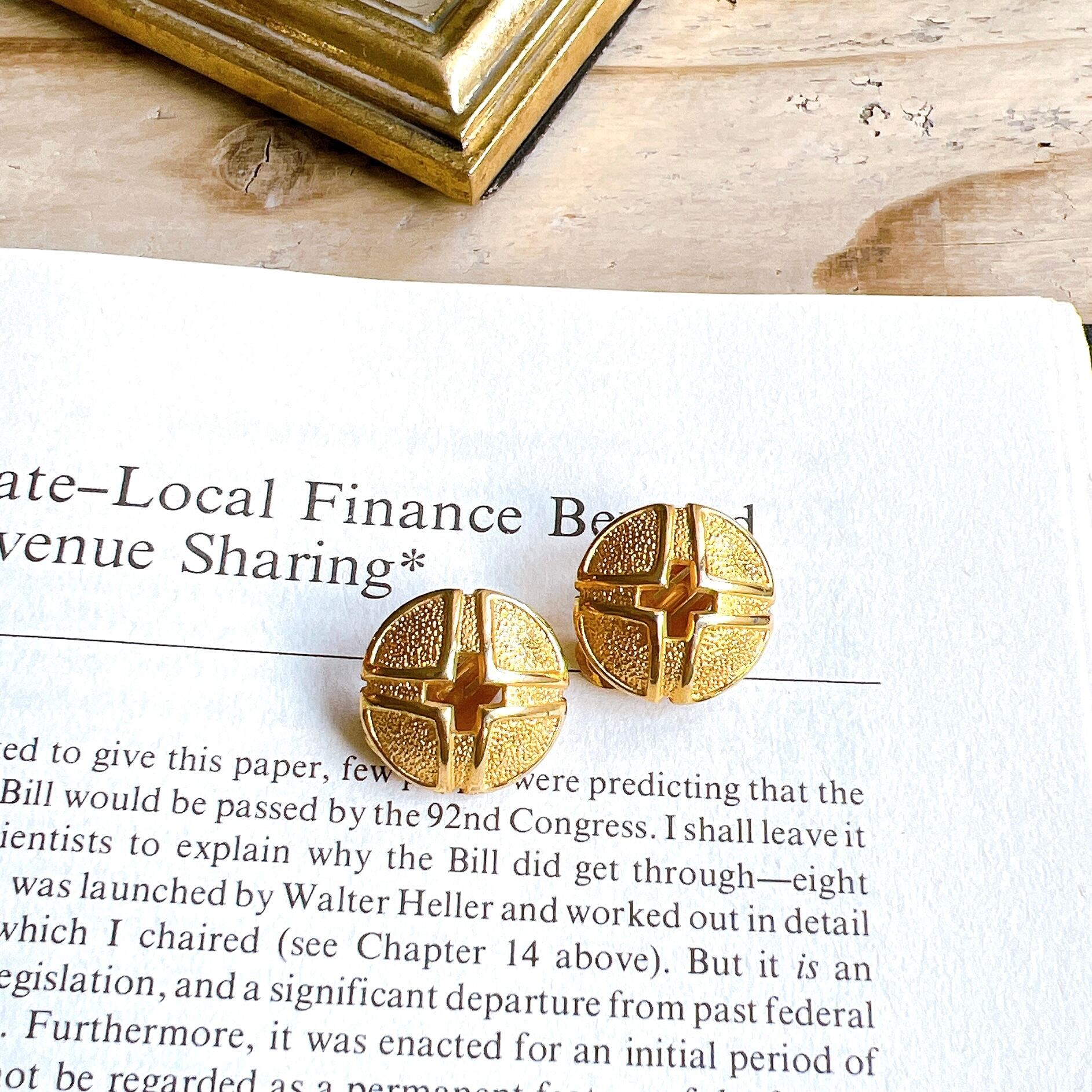 ゴールドトーンの、まるでアンティークな金ボタンのようなイヤリング。