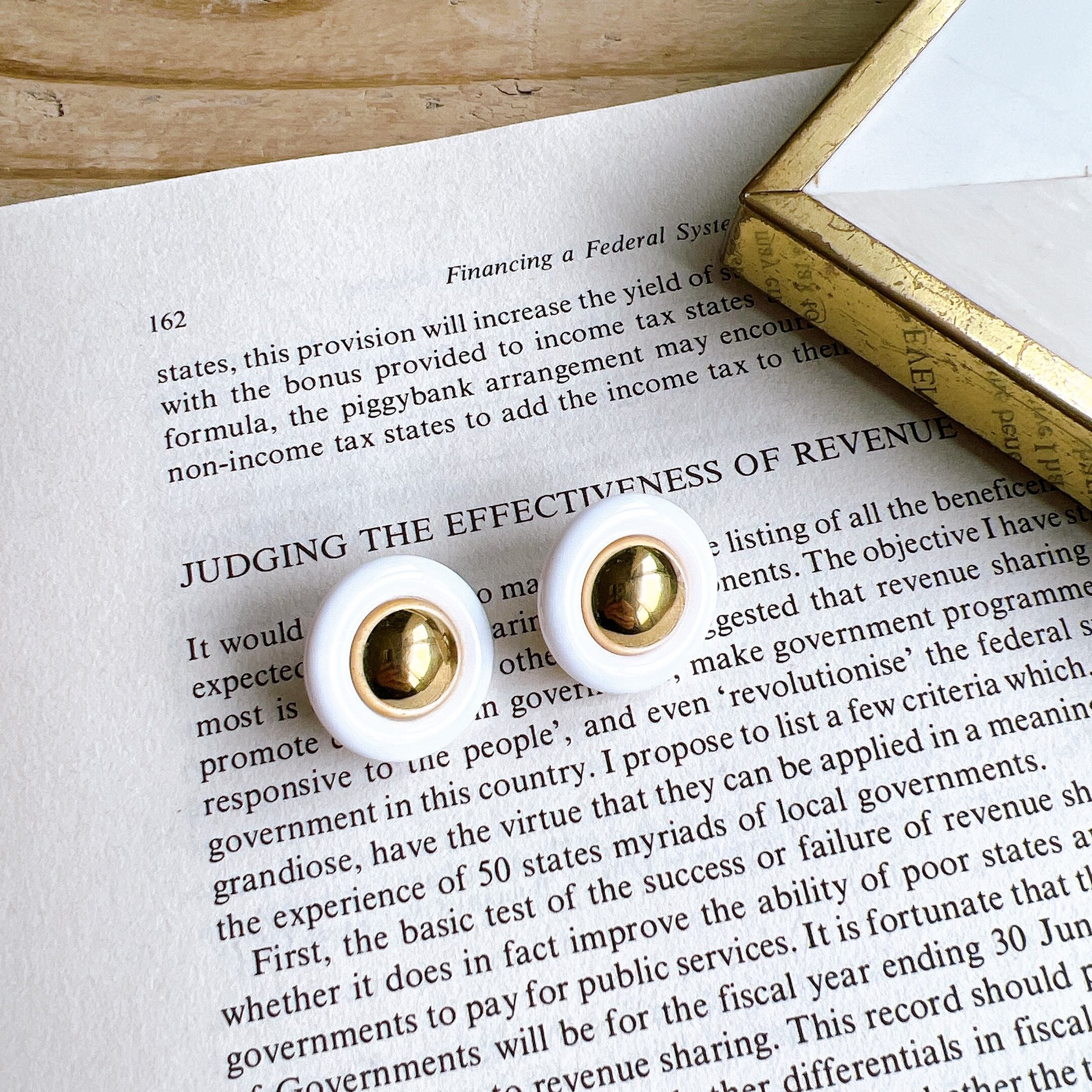 ホワイトのアクリルとゴールドトーンの組み合わせクリップイヤリング。立体感ある中央のゴールドトーンの丸みのあるフォルム。レトロなボタンのようなシンプルなデザインで、存在感のあるイヤリングです。