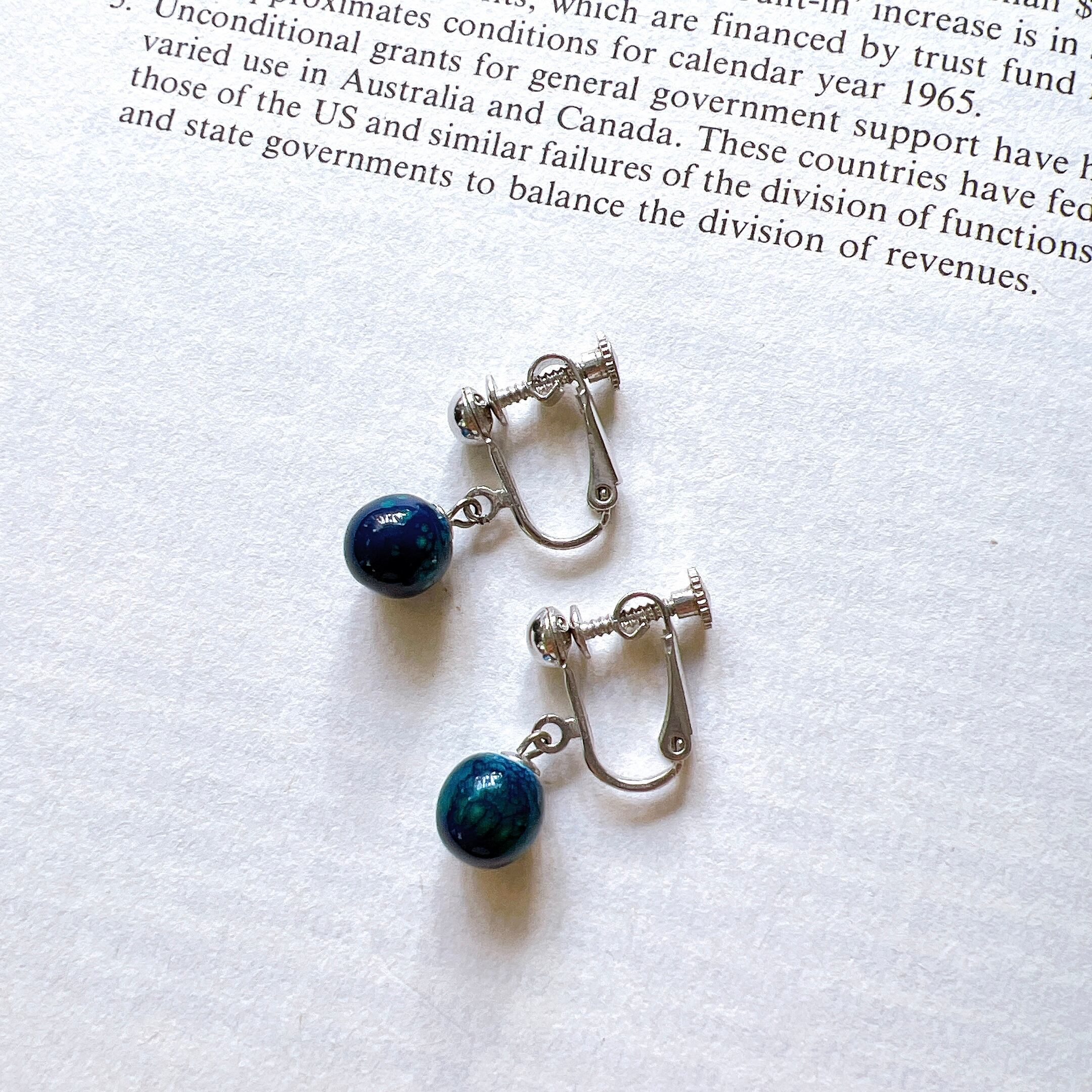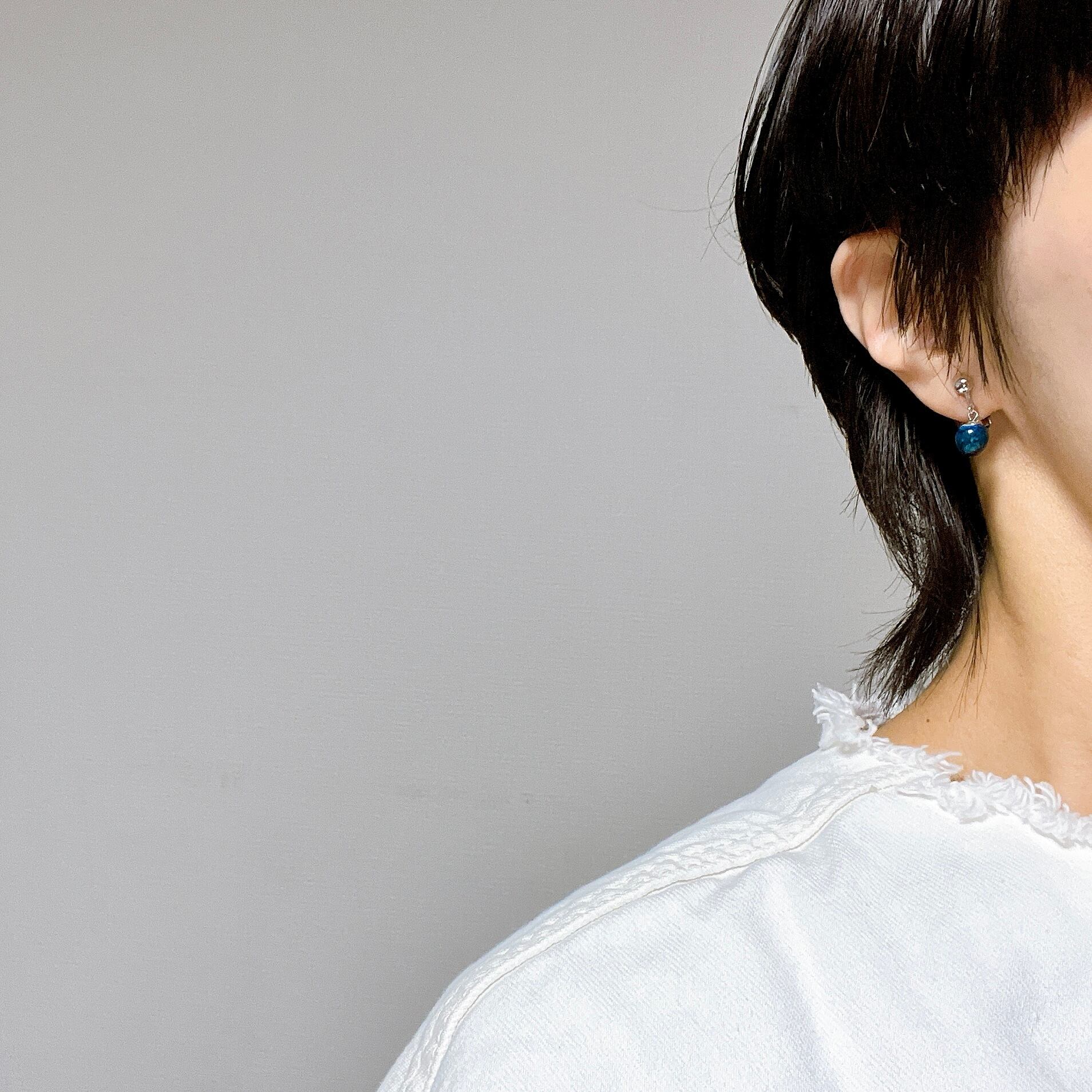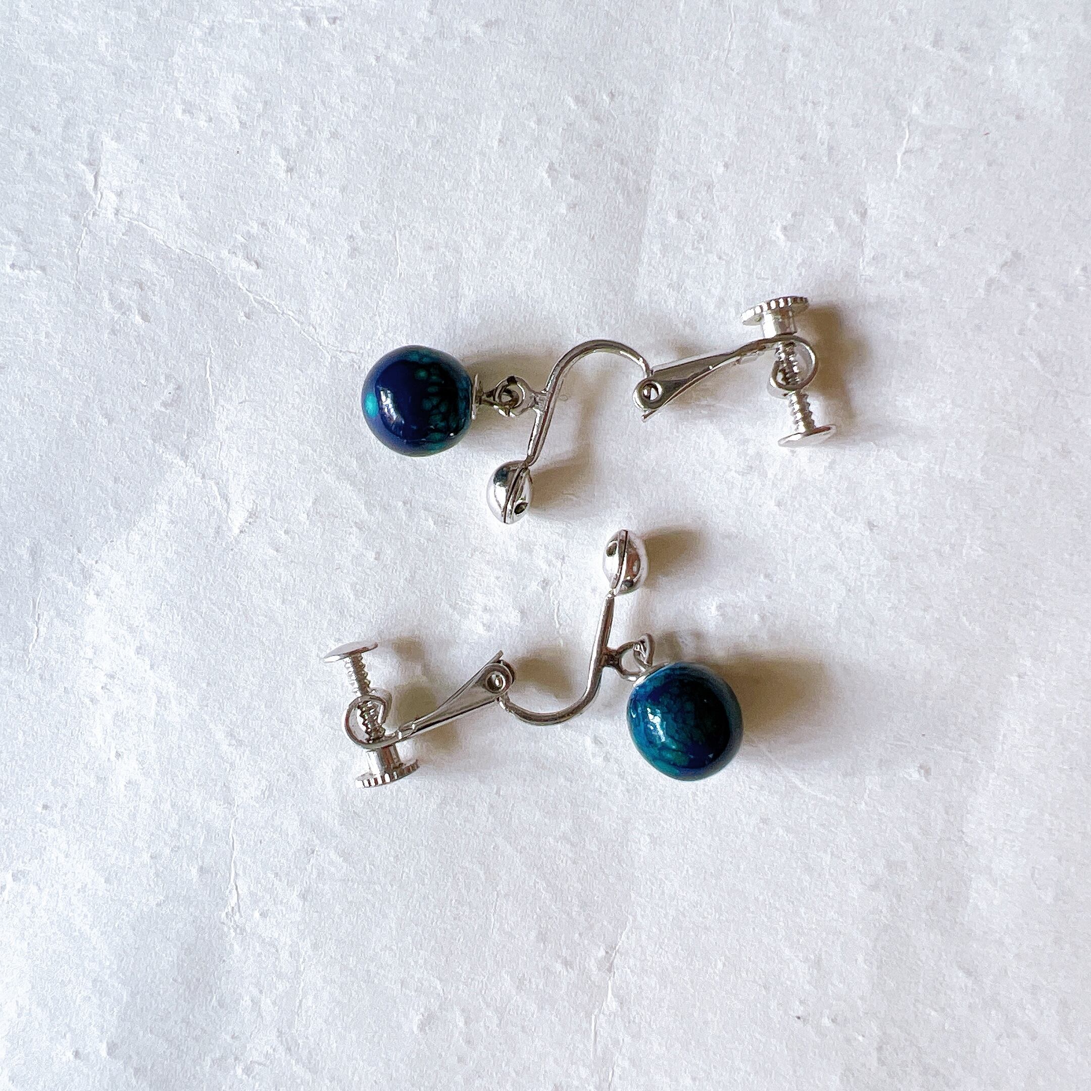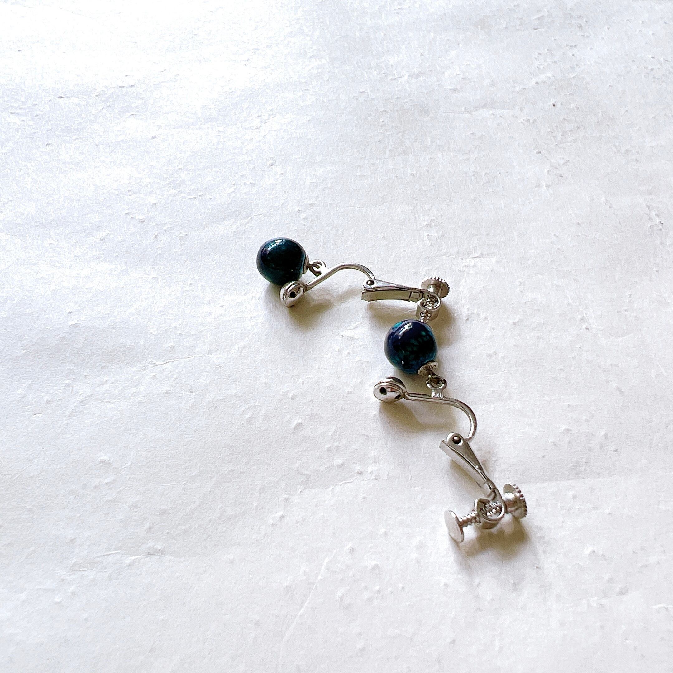 深いブルーのマーブルが印象的なビーズイヤリング。シルバートーンをベースに、小ぶりでまんまるなビーズがアクセントで素敵です。