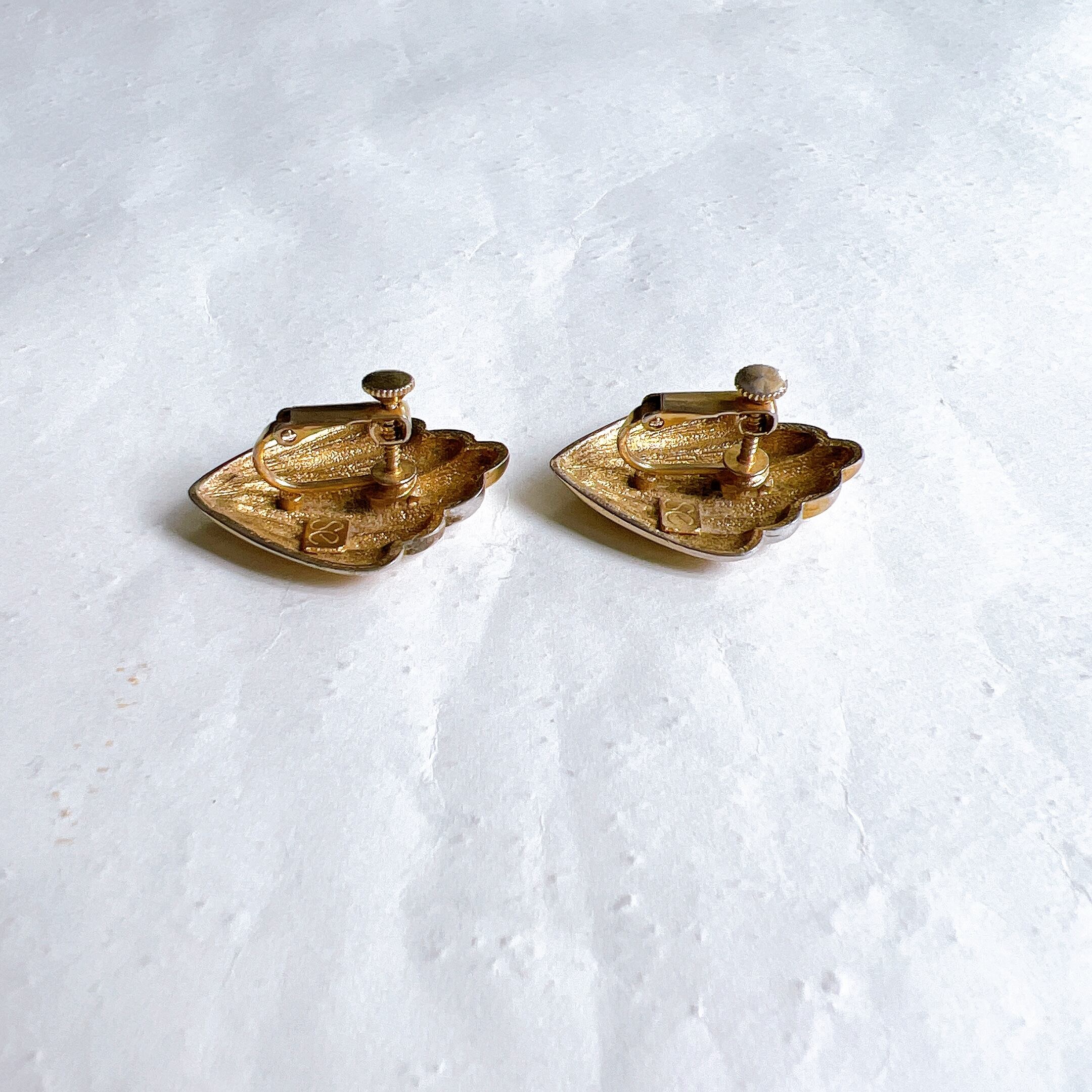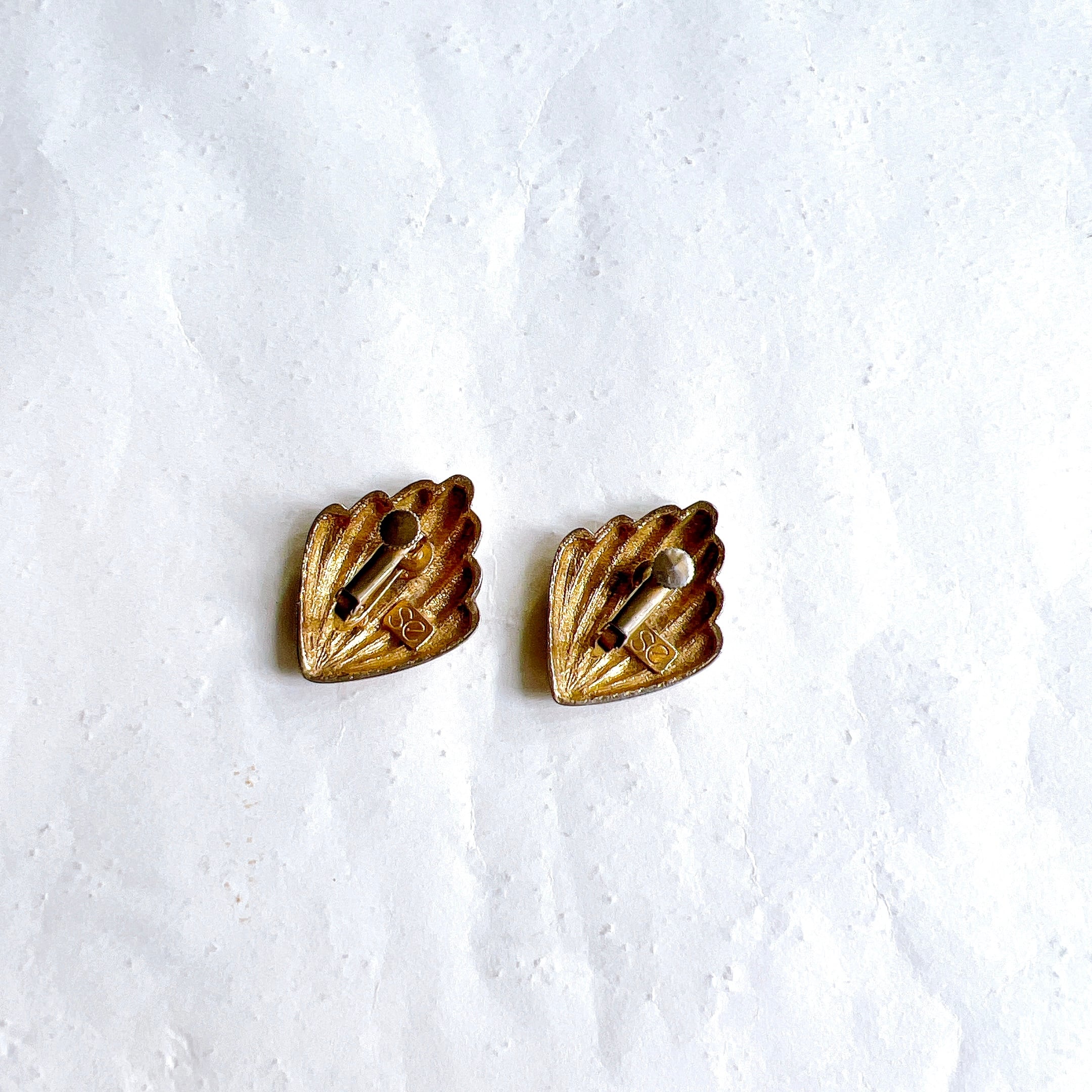 ゴールドトーンのフェザーモチーフイヤリング。艶のあるテクスチャーと程よく大きめのサイズがレトロで華やかな印象です。