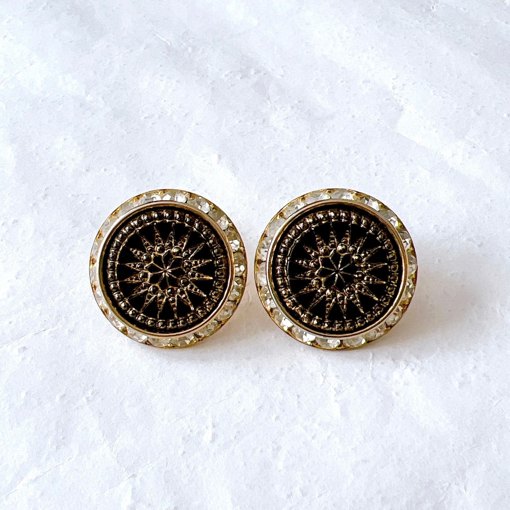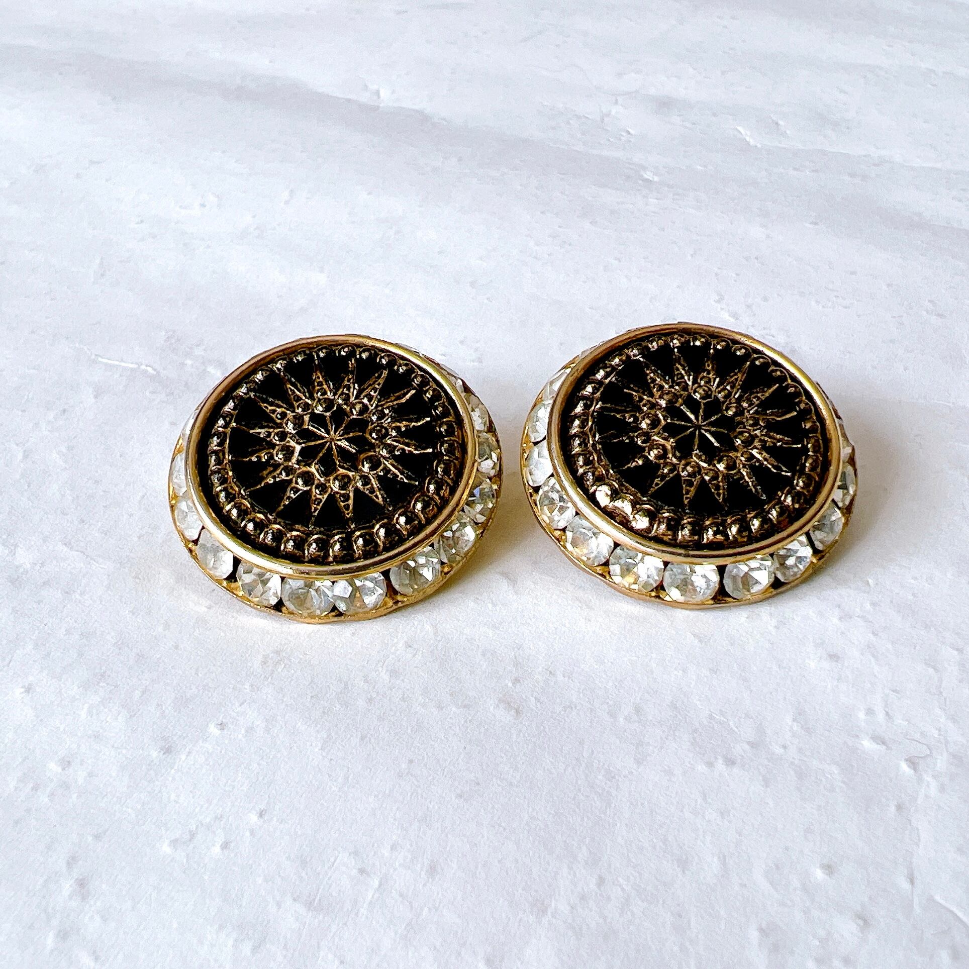 ゴールドトーンをベースに、ブラックのガラスを細かくカッティングしたデザインのラウンドイヤリング。クリアなラインストーンで囲まれた、モダンでエレガントな印象です。