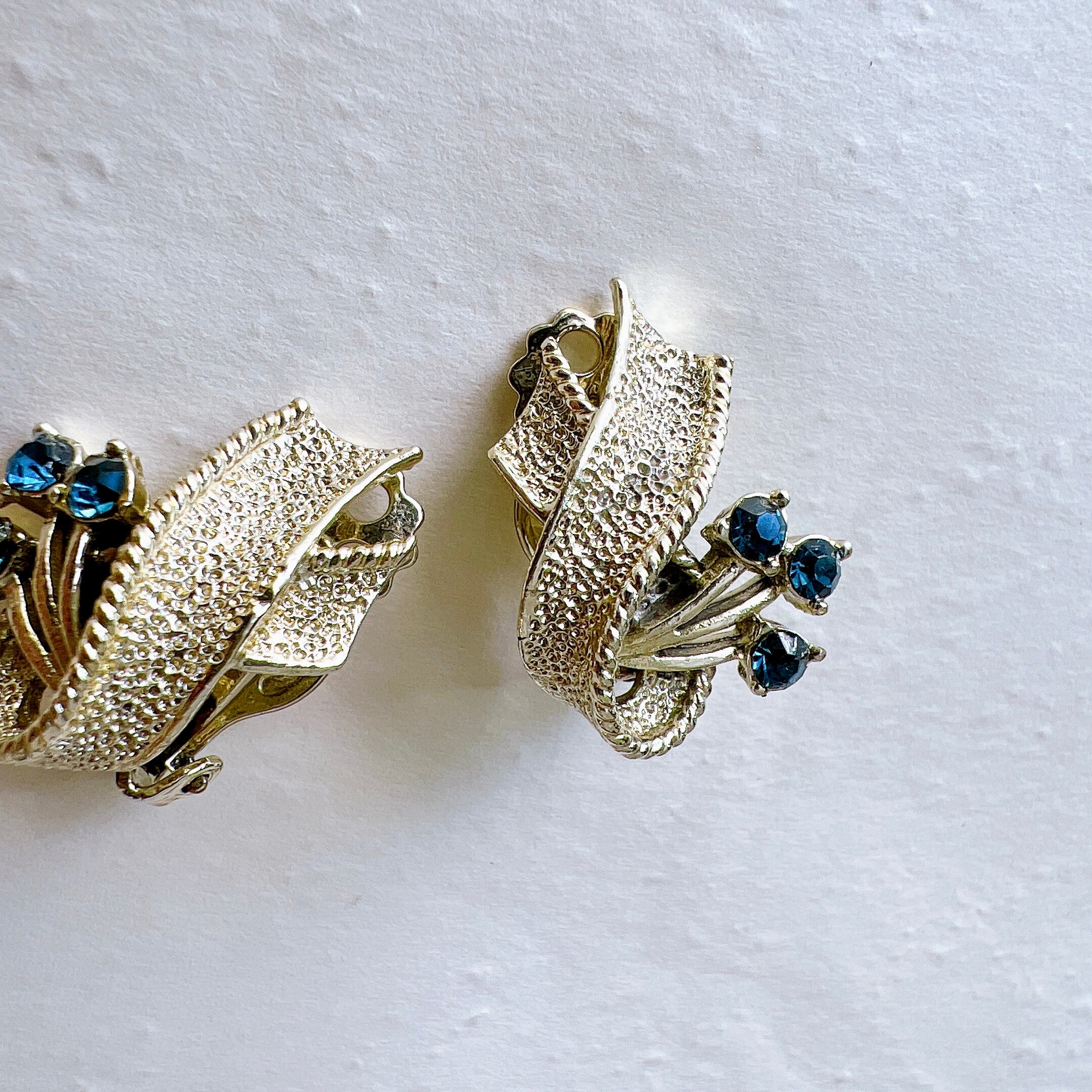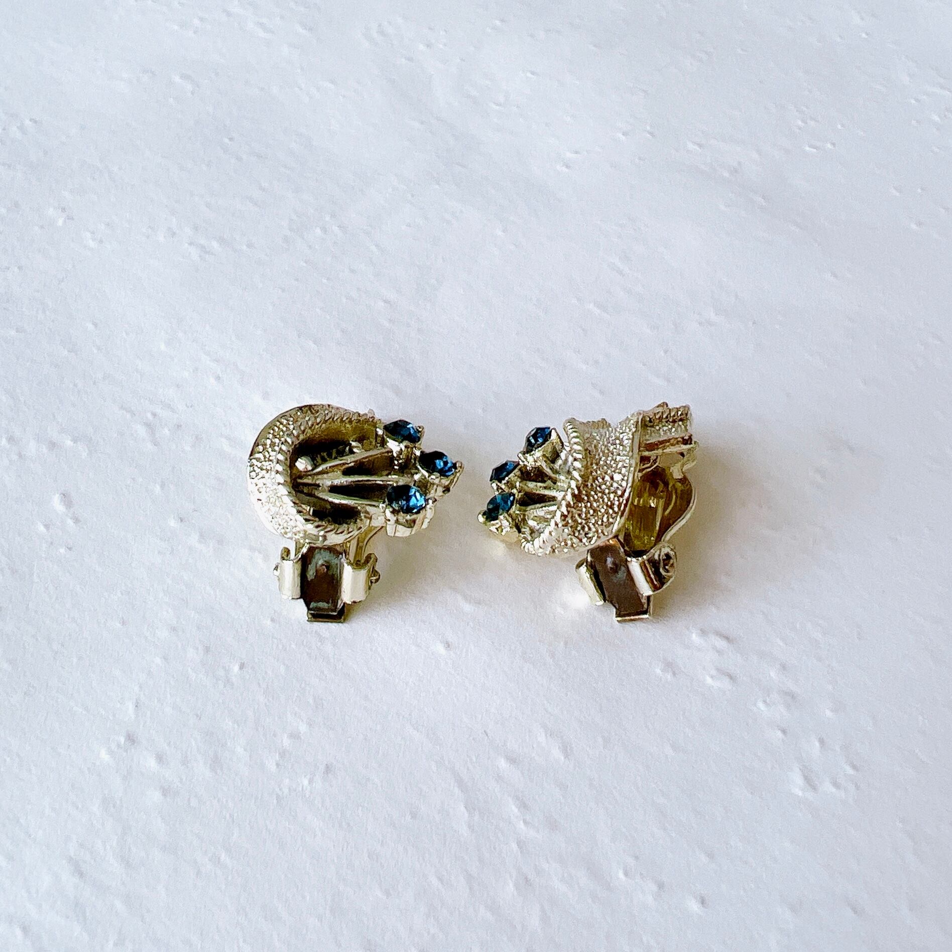 Y771-ヴィンテージイヤリング・USA 1950〜60s Silver Tone and Blue Rhinestone Ribbon bouquet motif Clip Earrings | eslup_boutique