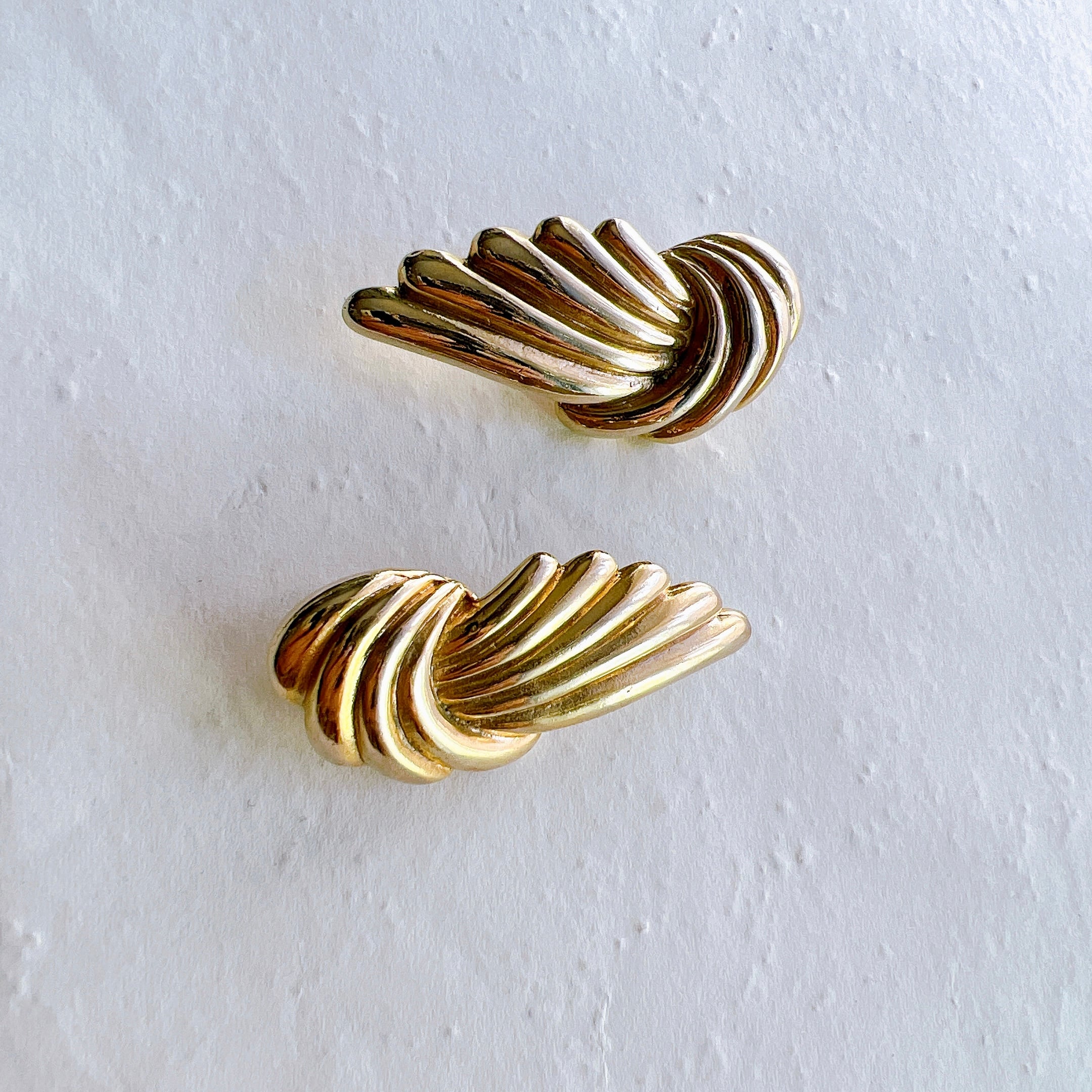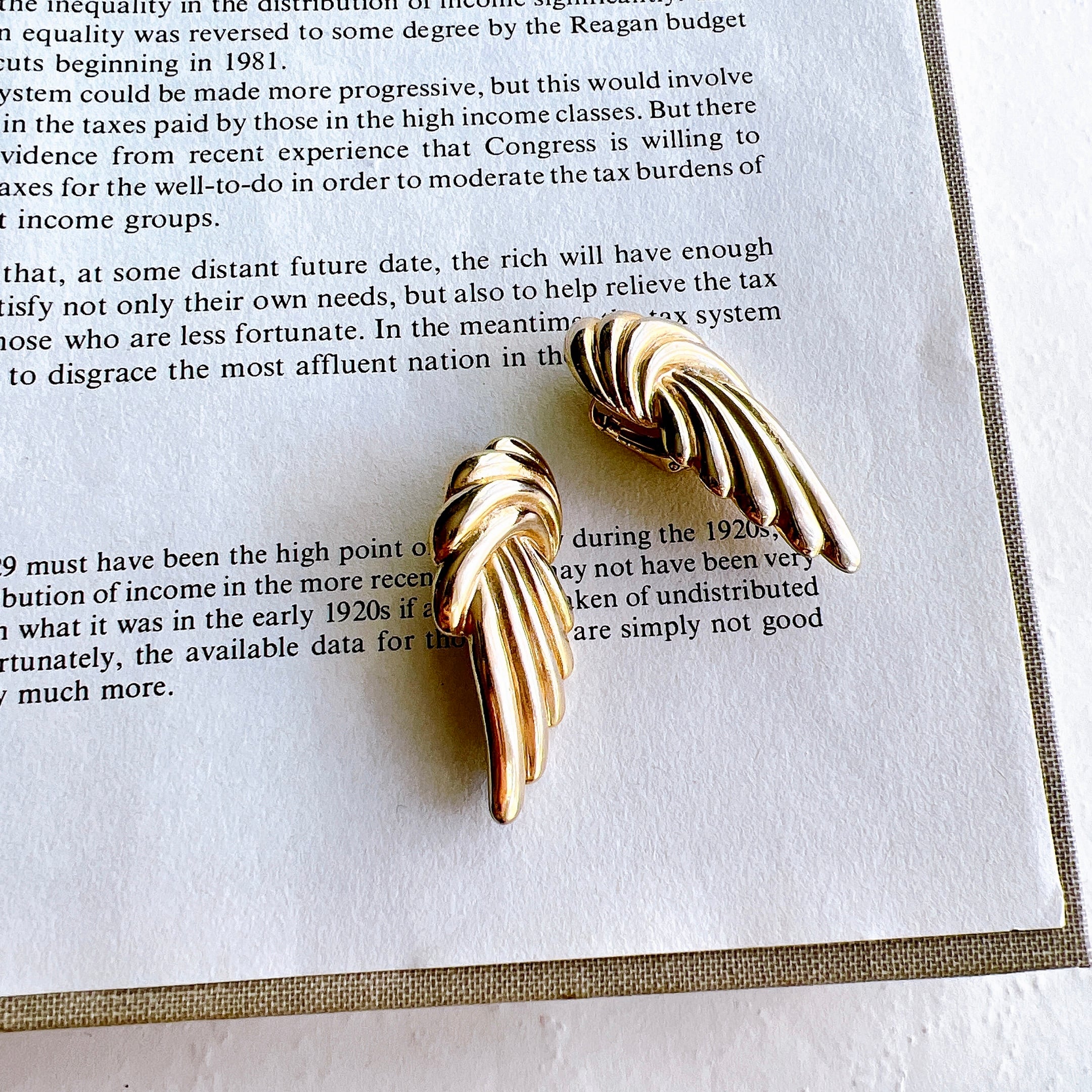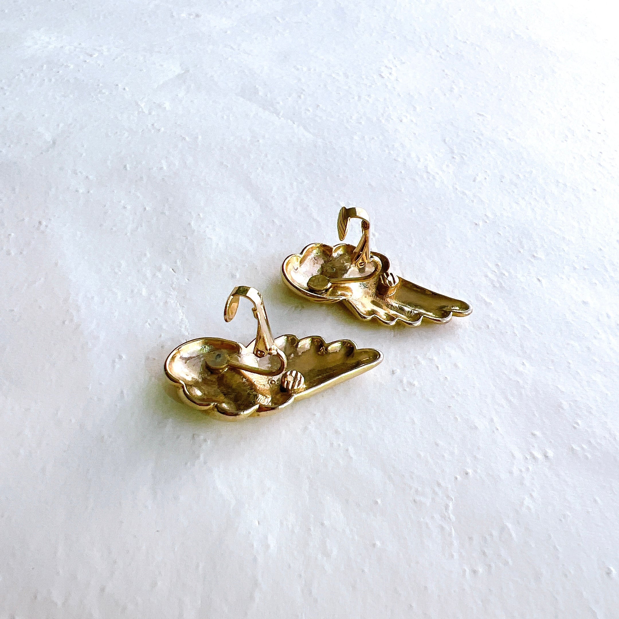 艶めくゴールドトーンのフェザーモチーフクリップイヤリング。曲線的なラインとなだらかなフォルム。程よい大きさが優雅さと大胆な印象を与え、レトロで上品です。