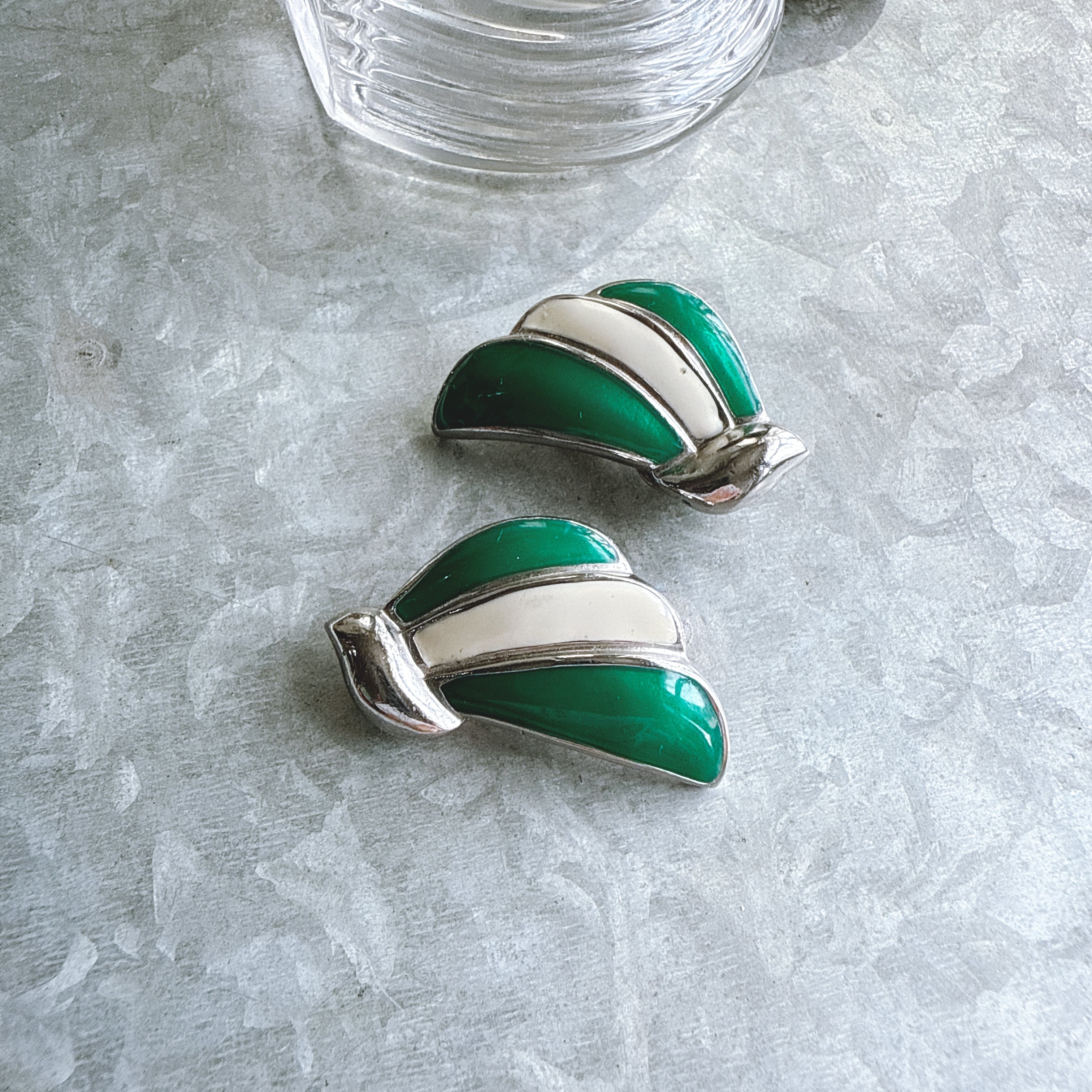 シルバートーンベースにエメラルドグリーン、ホワイトのエナメルペイントされた爽やかな佇まいのあるイヤリング。