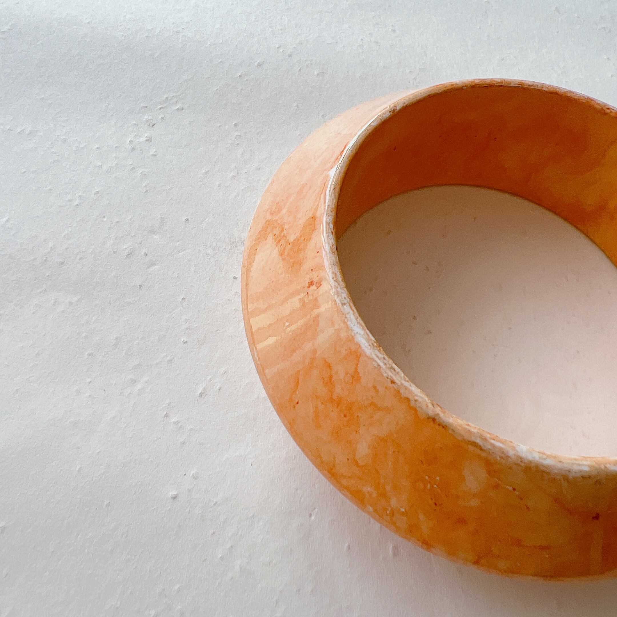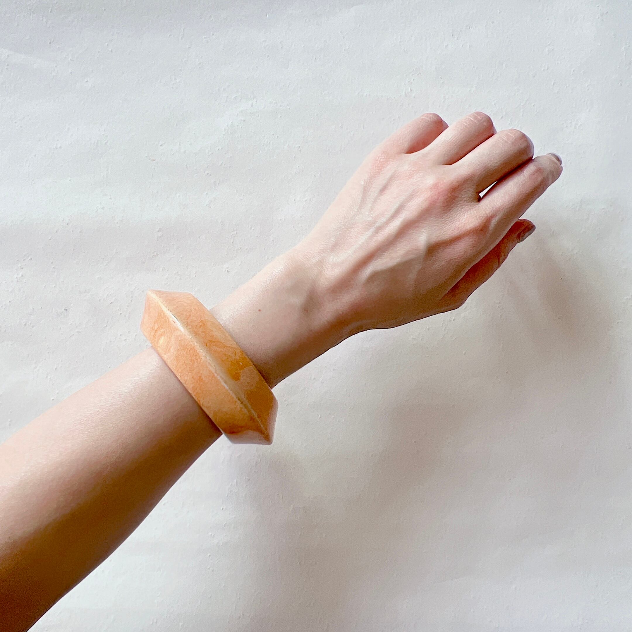 柔らかなカラーでの太めのチャンキーなバングルは、レトロで個性的ながらにさりげなく品があります。