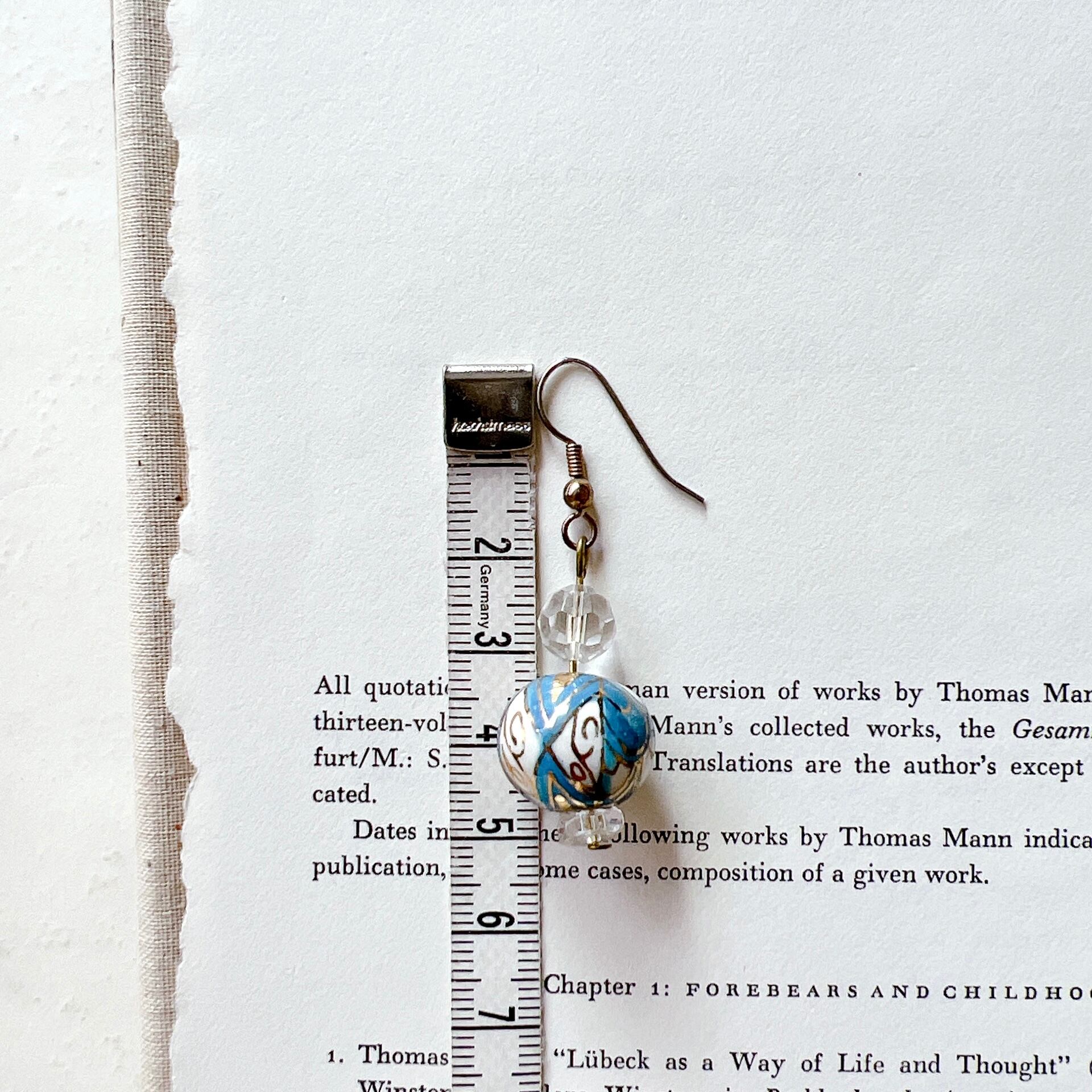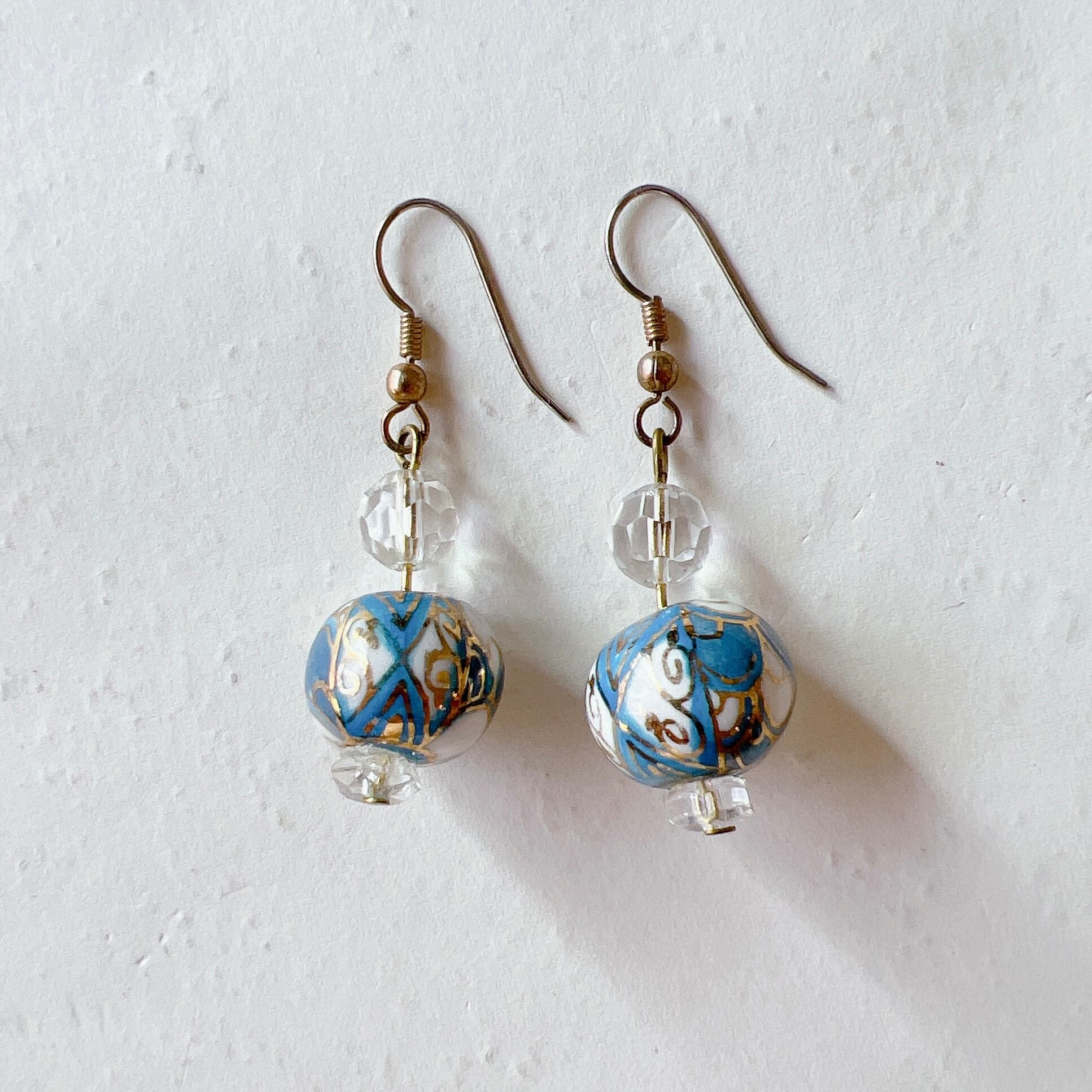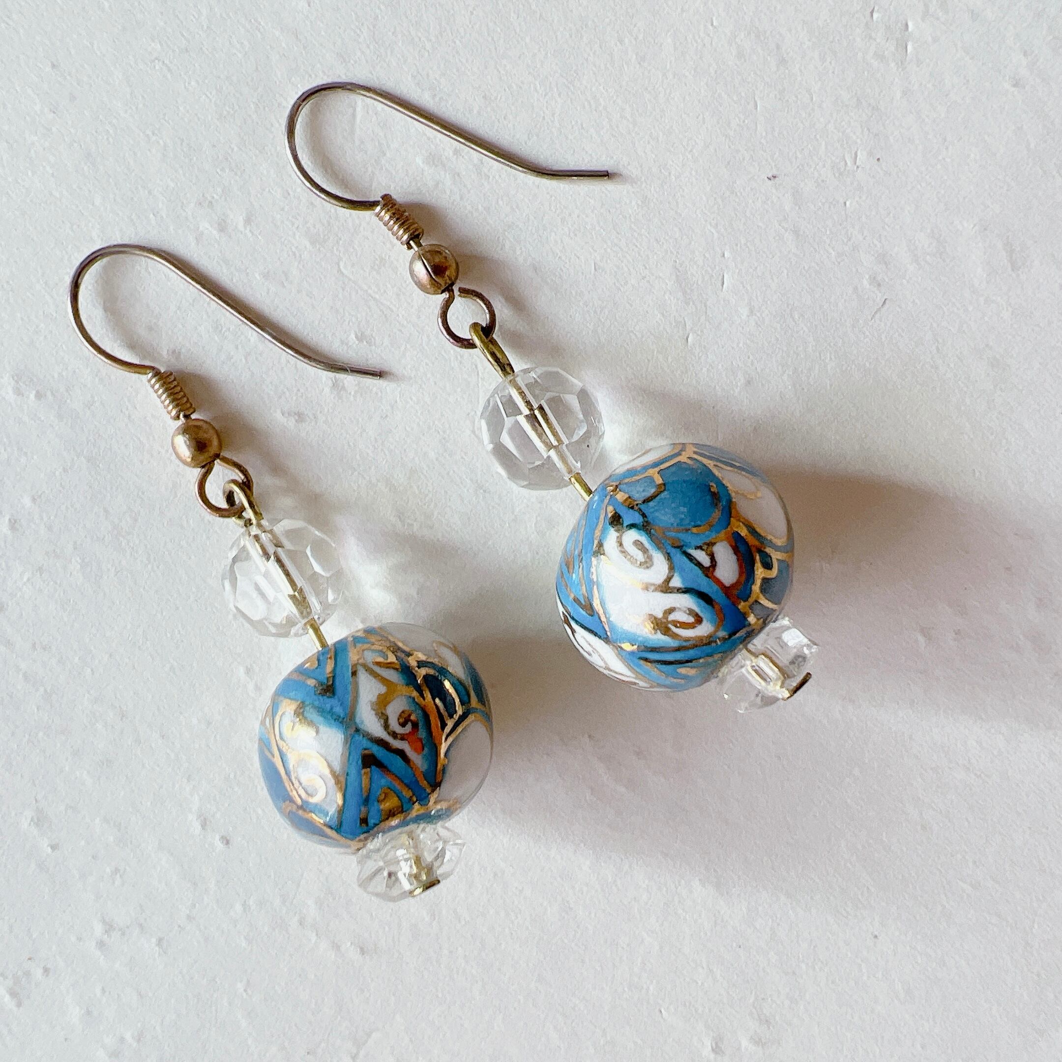 セラミックビーズにサックスブルーのペイント、ゴールドで描かれた、アジアンテイストのオリエンタルな印象のスイングピアス。クリアなアクリルビーズがアクセントで涼しげな印象です。