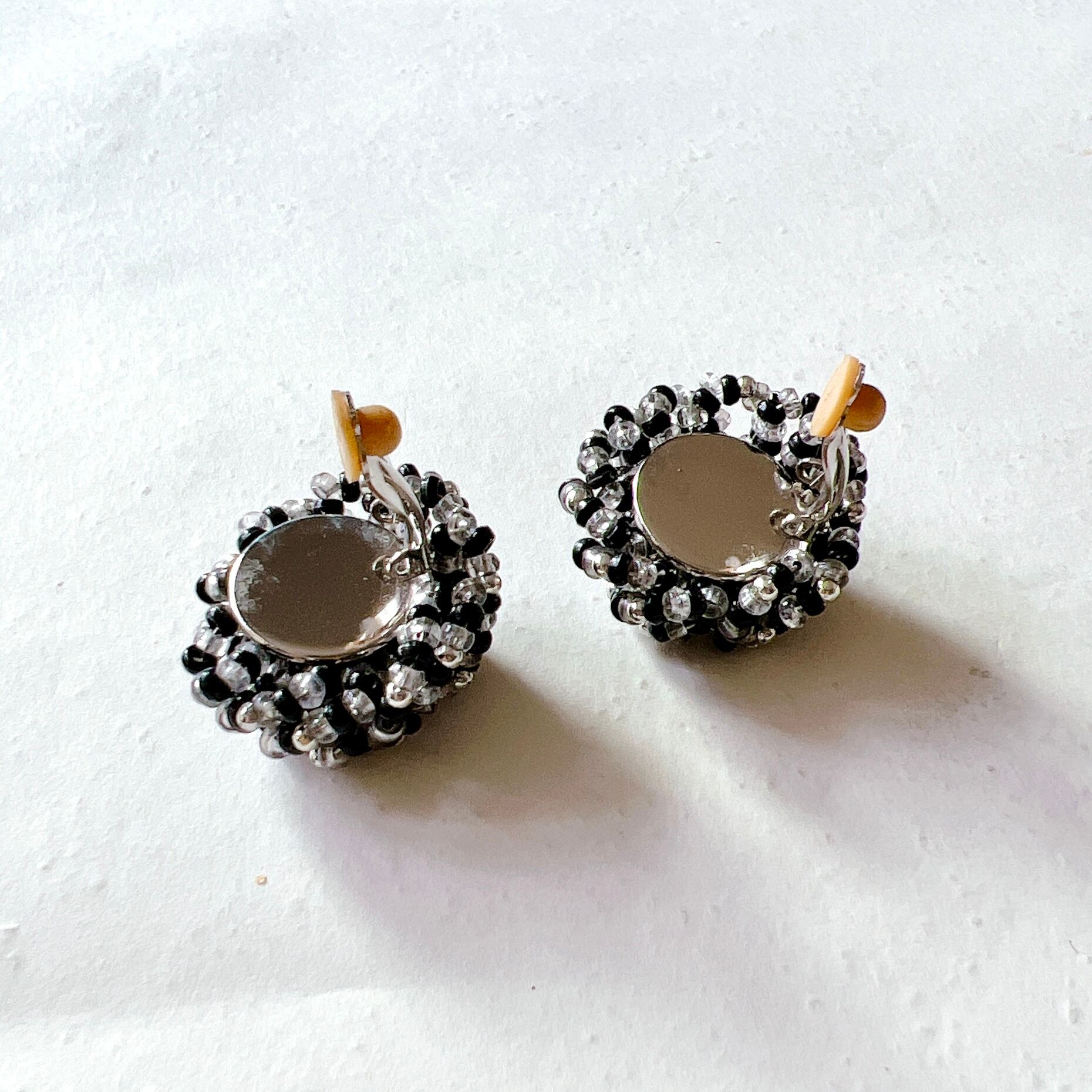 ブラック、クリアー、シルバーメタルの3色ビーズのイヤリング。ビーズを螺旋状に巻かれたボリューム感のあるデザイン。モノトーンビーズでシックで品のある印象です。