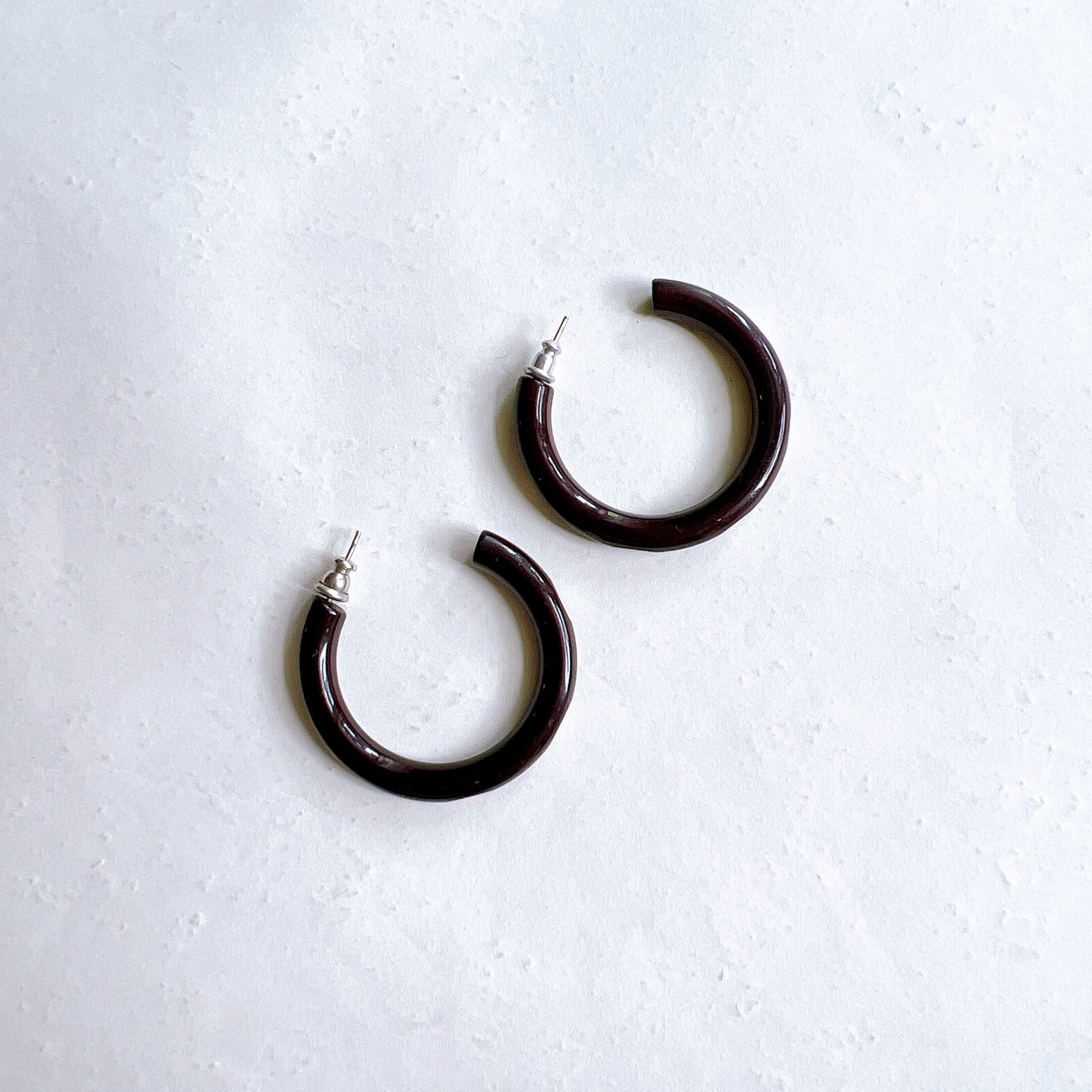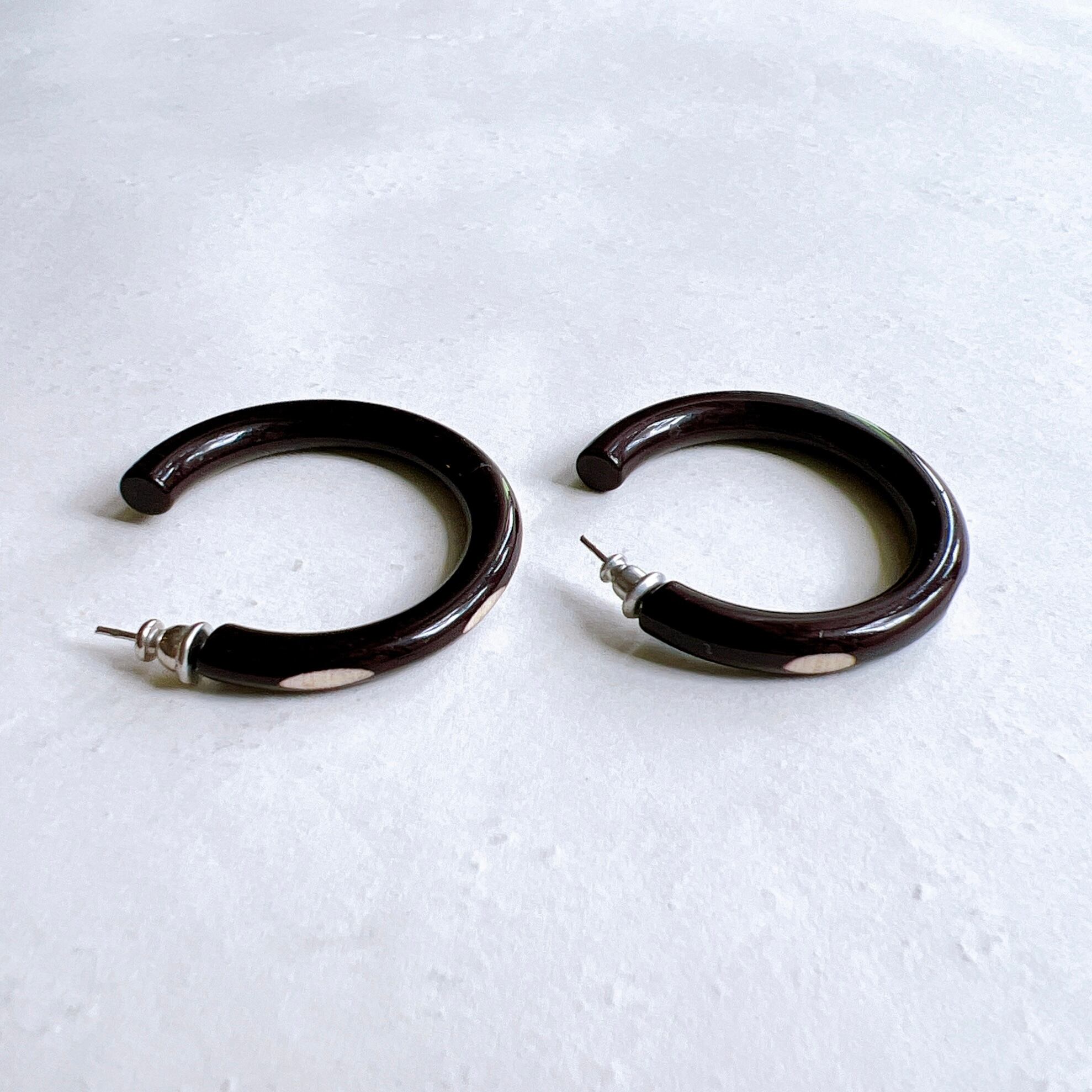 ブラックに近い、深いカラーのダークブラウンエナメルペイントのフープピアス。オーバル型にカットされた模様が際立つ、レトロで個性あるデザイン。