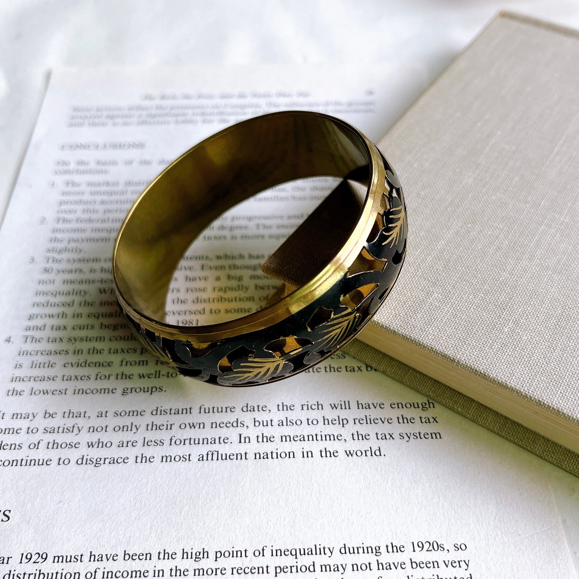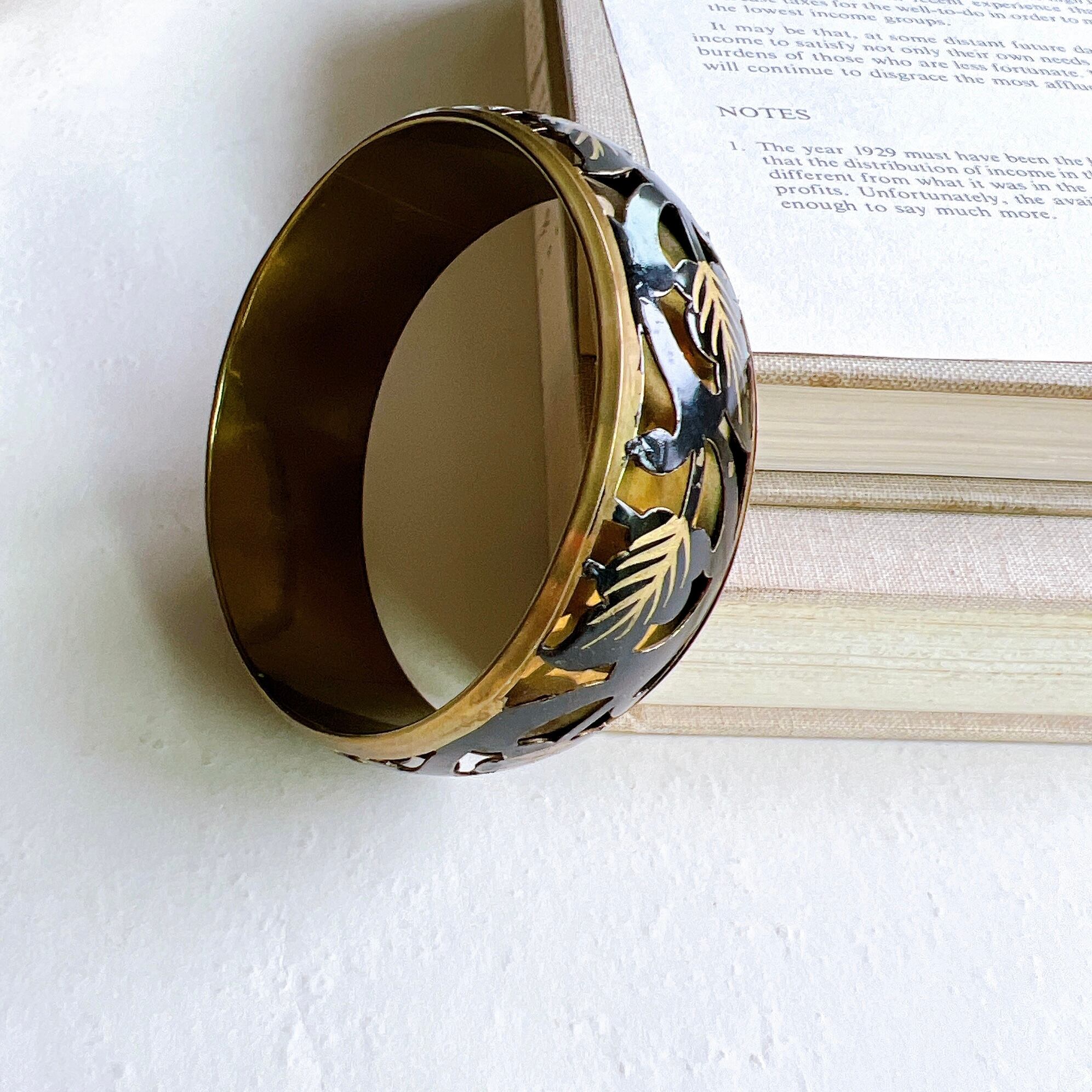 B98-ヴィンテージバングル U.S.A. 1970〜80s Botanical pattern openwork design black enamel paint gold tone bangle | eslup_boutique