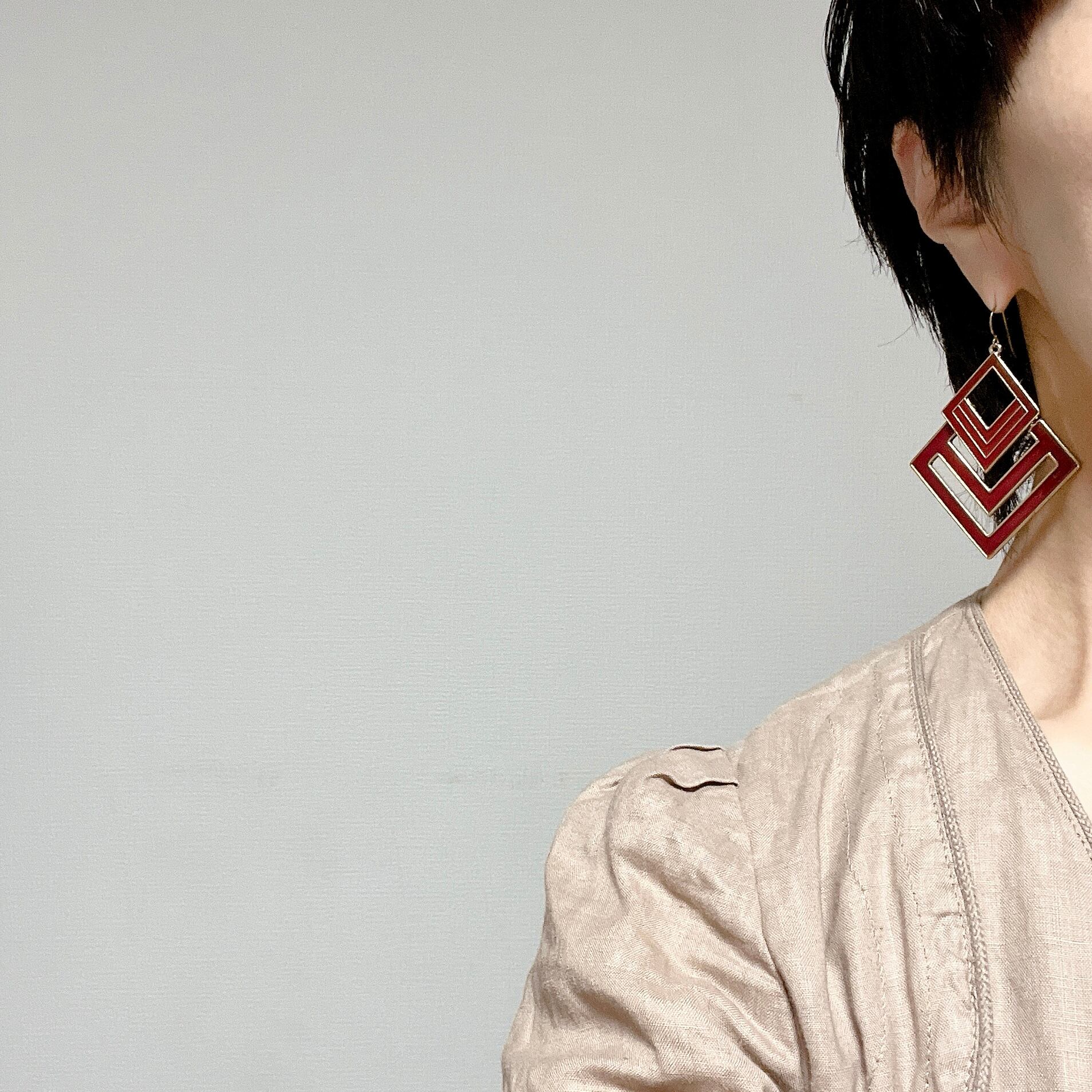 ゴールドトーンをベースに、ボルドーのエナメルペイントされた大ぶりピアス。