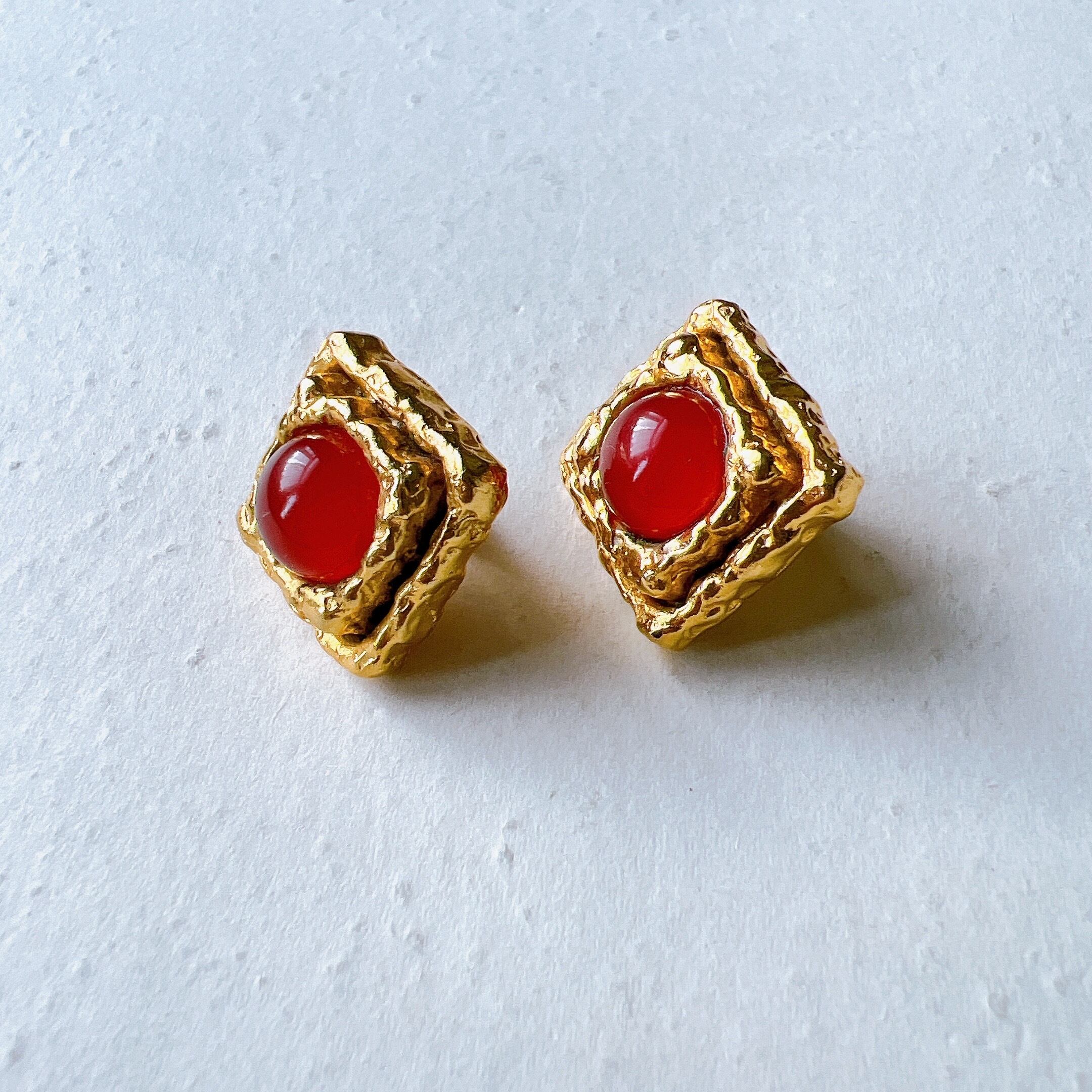 赤いカボションが印象的なゴールドトーンのスクエアイヤリング。