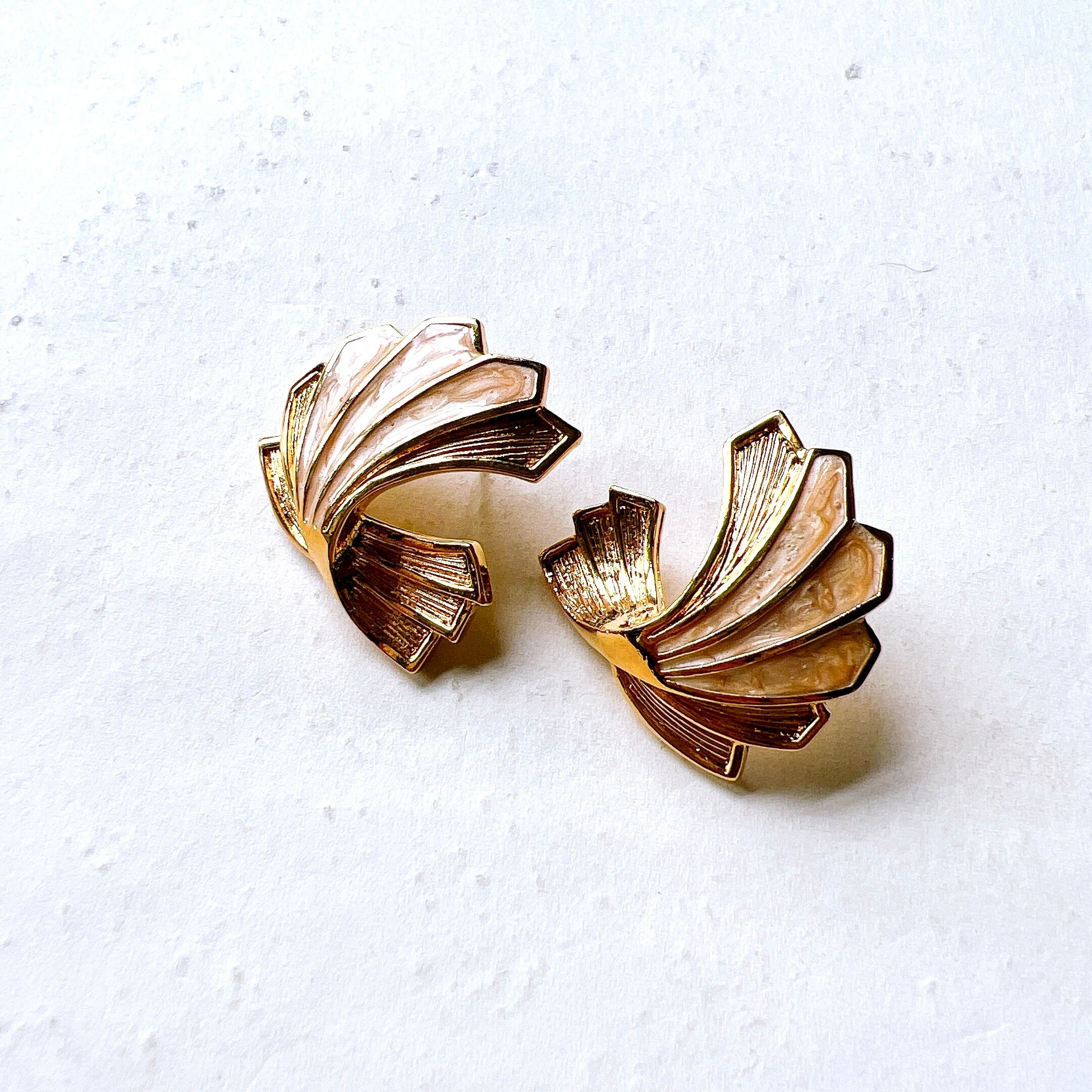 PA136-【 AVON 】エイボン・ヴィンテージピアス 1980s Fan motif gold tone salmon pink marble enamel painted earrings | eslup_boutique