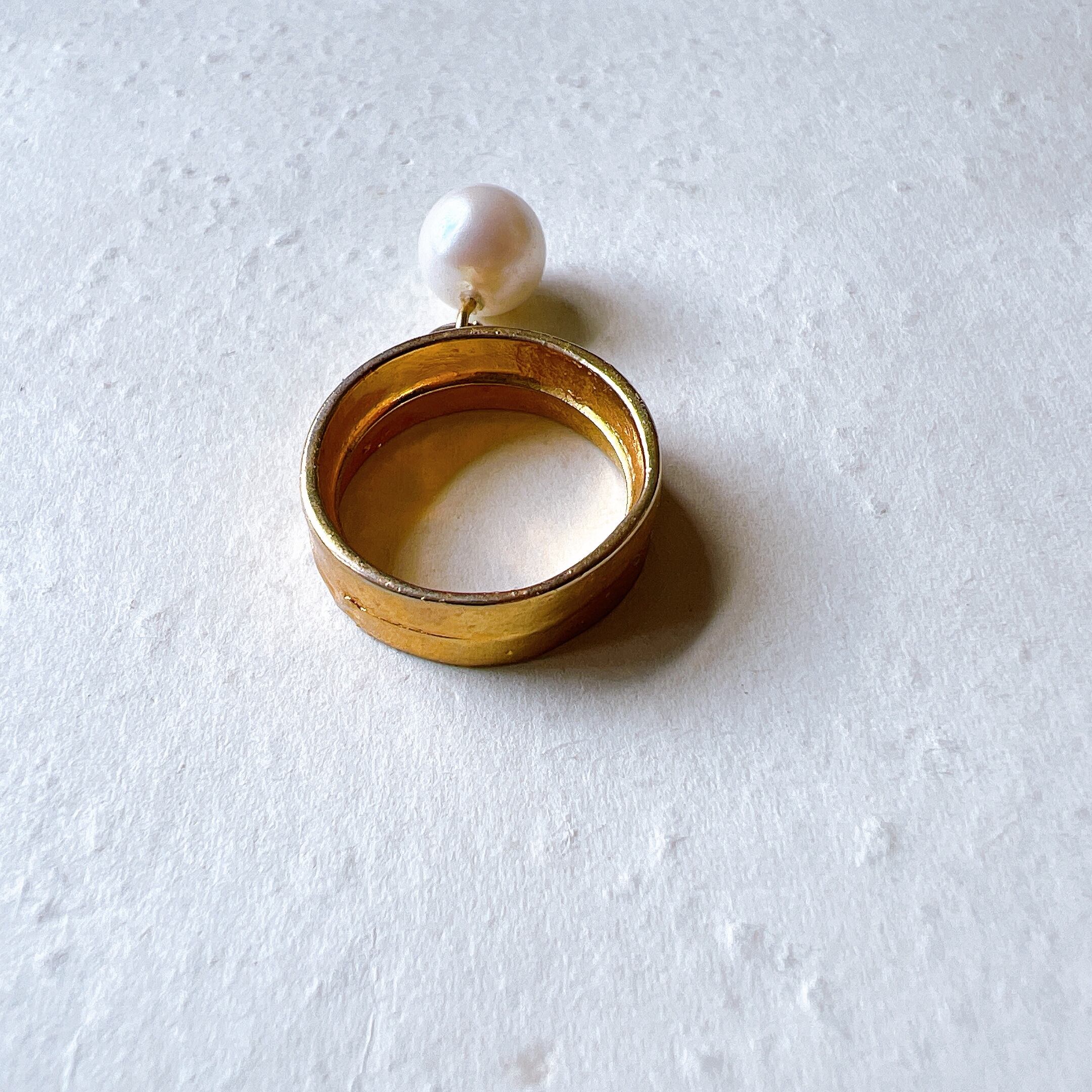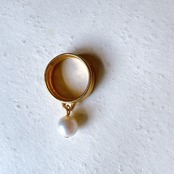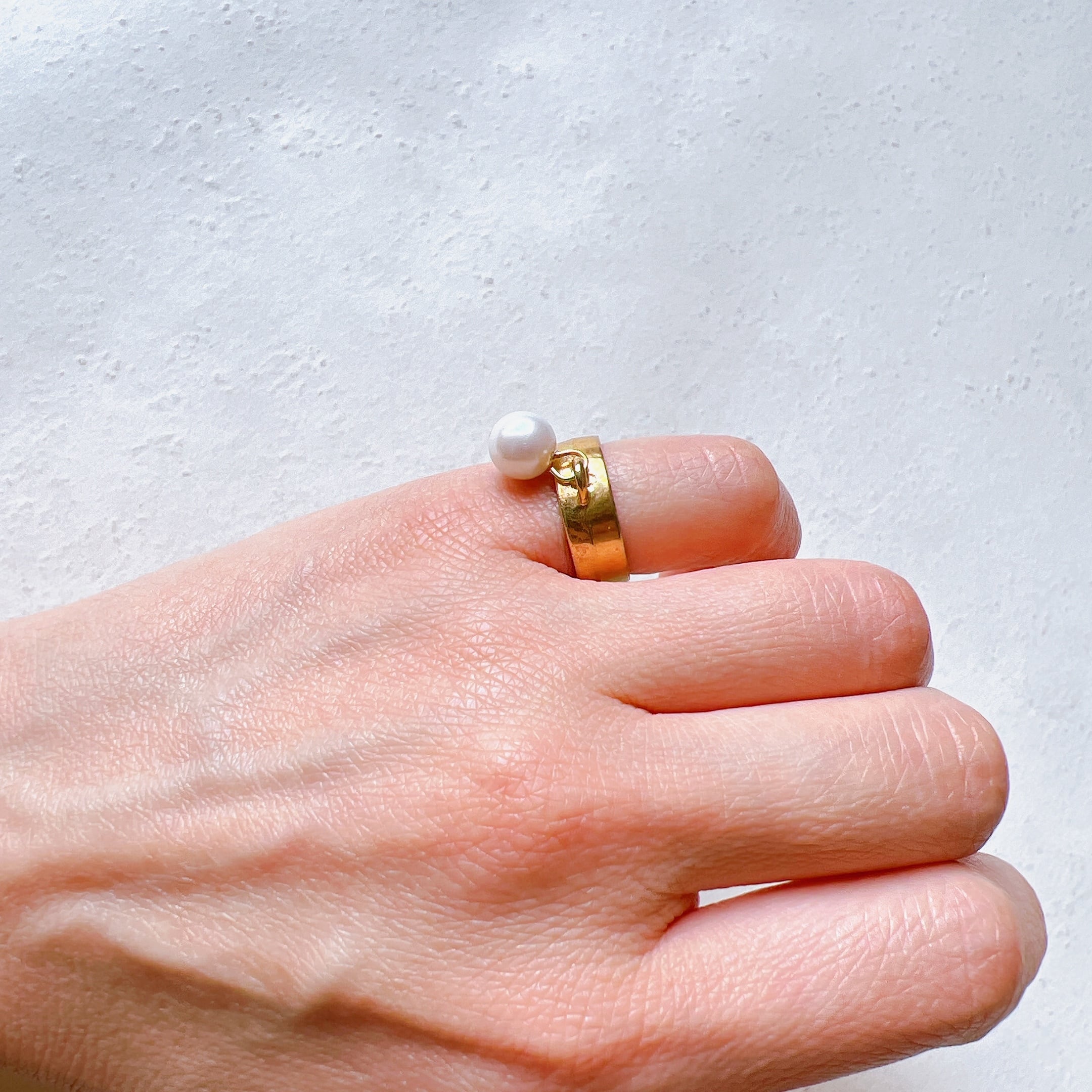 中央に細くラインが入ったクラフト感のあるモダンな印象のデザイン。幅6mmほどの太さのリングと、パールの組み合わせがアートモダンを感じさせます。