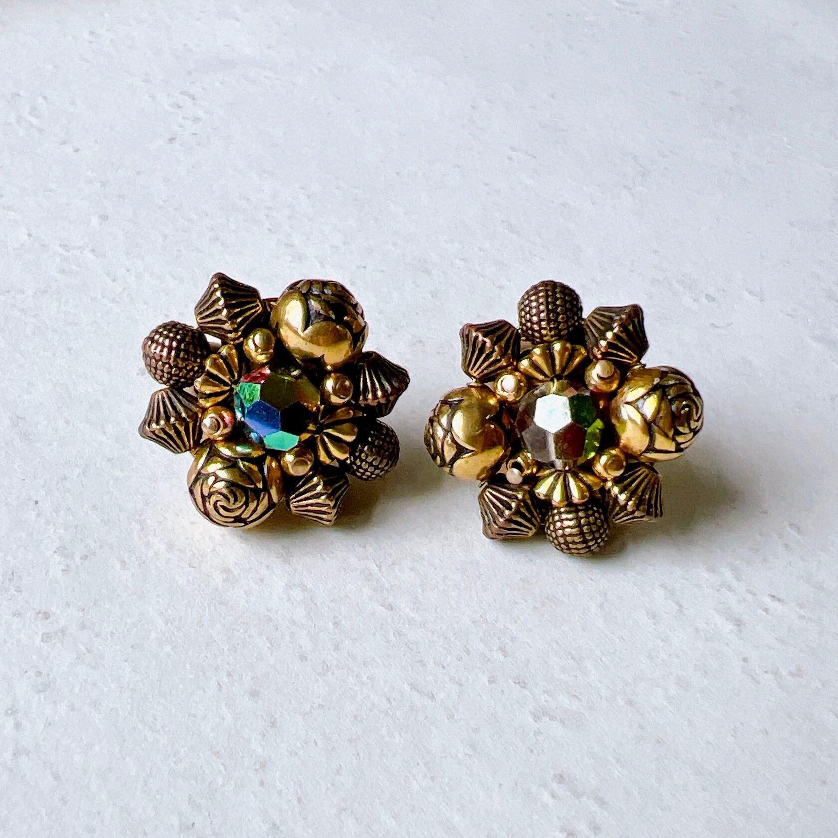 オーロラカラーのクリスタルカットビーズを中心に、ゴールドカラーのマルチビーズクラスターピアス。