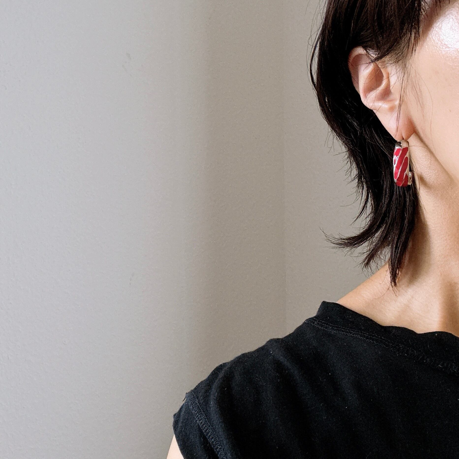 シルバートーンをベースにピンクのエナメルペイントが印象的なハーフフープピアス。