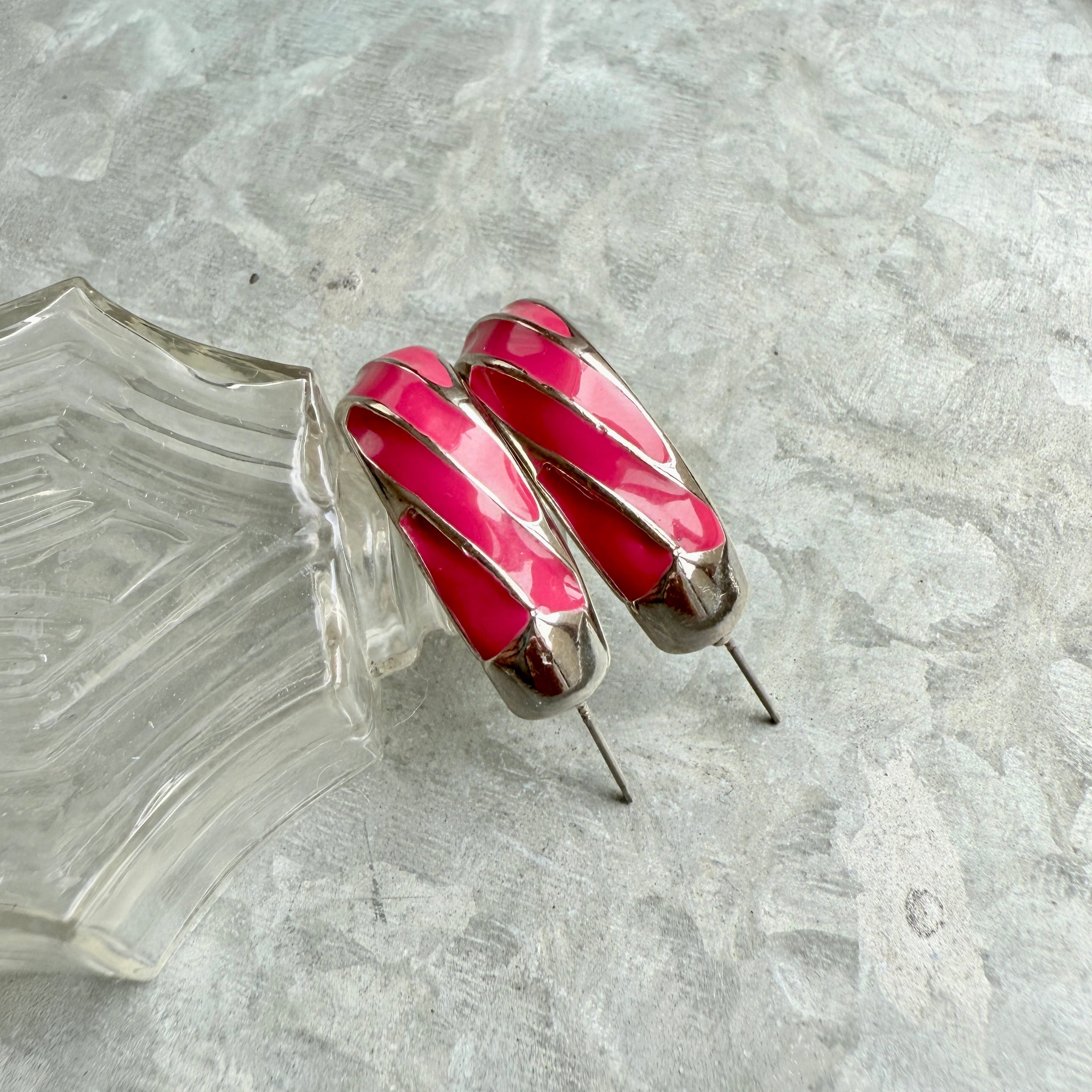 P542- ヴィンテージピアス U.S.A. 1980s Silver Tone Pink Enamel Harf Hoop Pierced Earrings