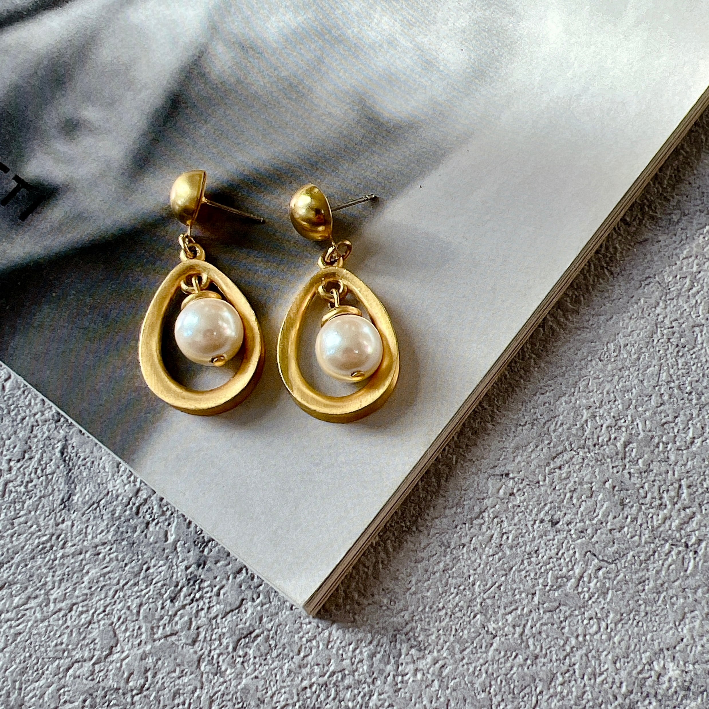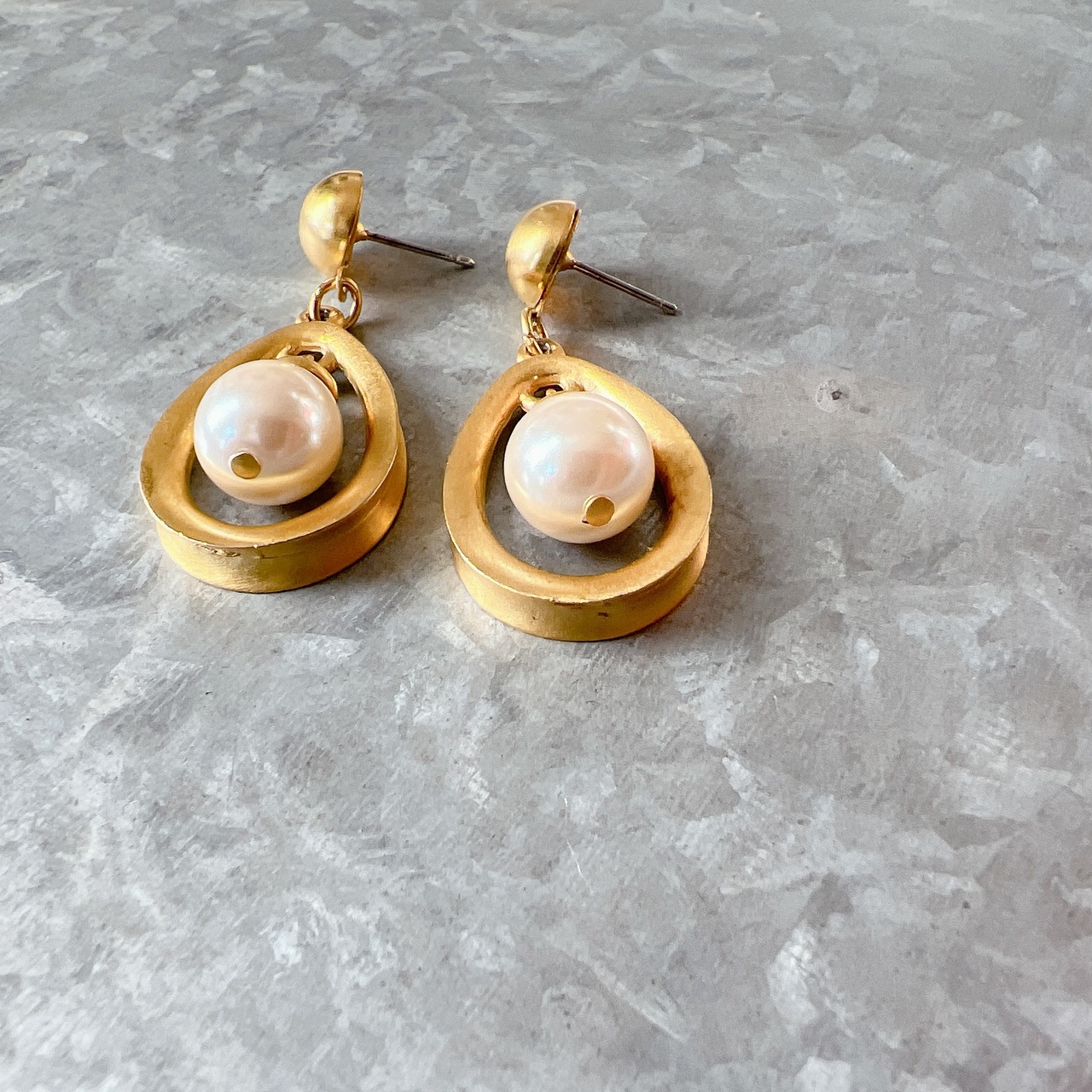 ドロップになったフープにパールがアクセントで、オリエンタルなエッセンスを感じさせながら、品よく個性を放ちます。また、マットな質感のゴールドトーンが落ち着きのある印象を与えます。