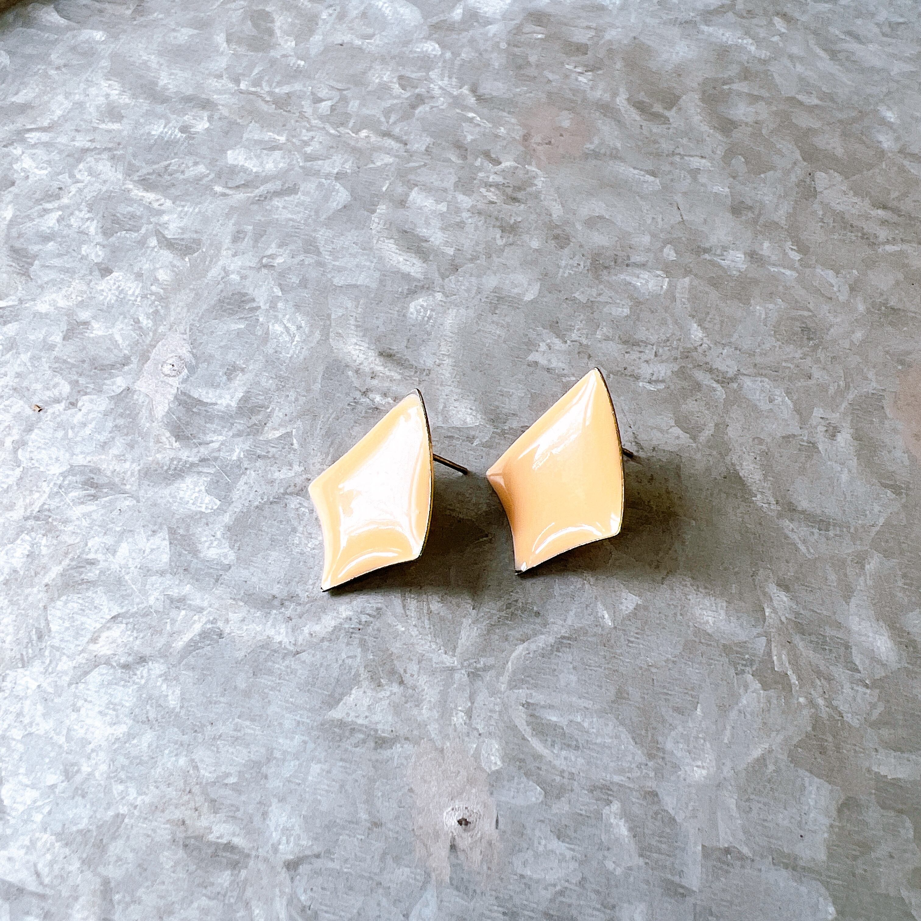 クリームベージュのエナメルペイントされた菱形プレートピアス。