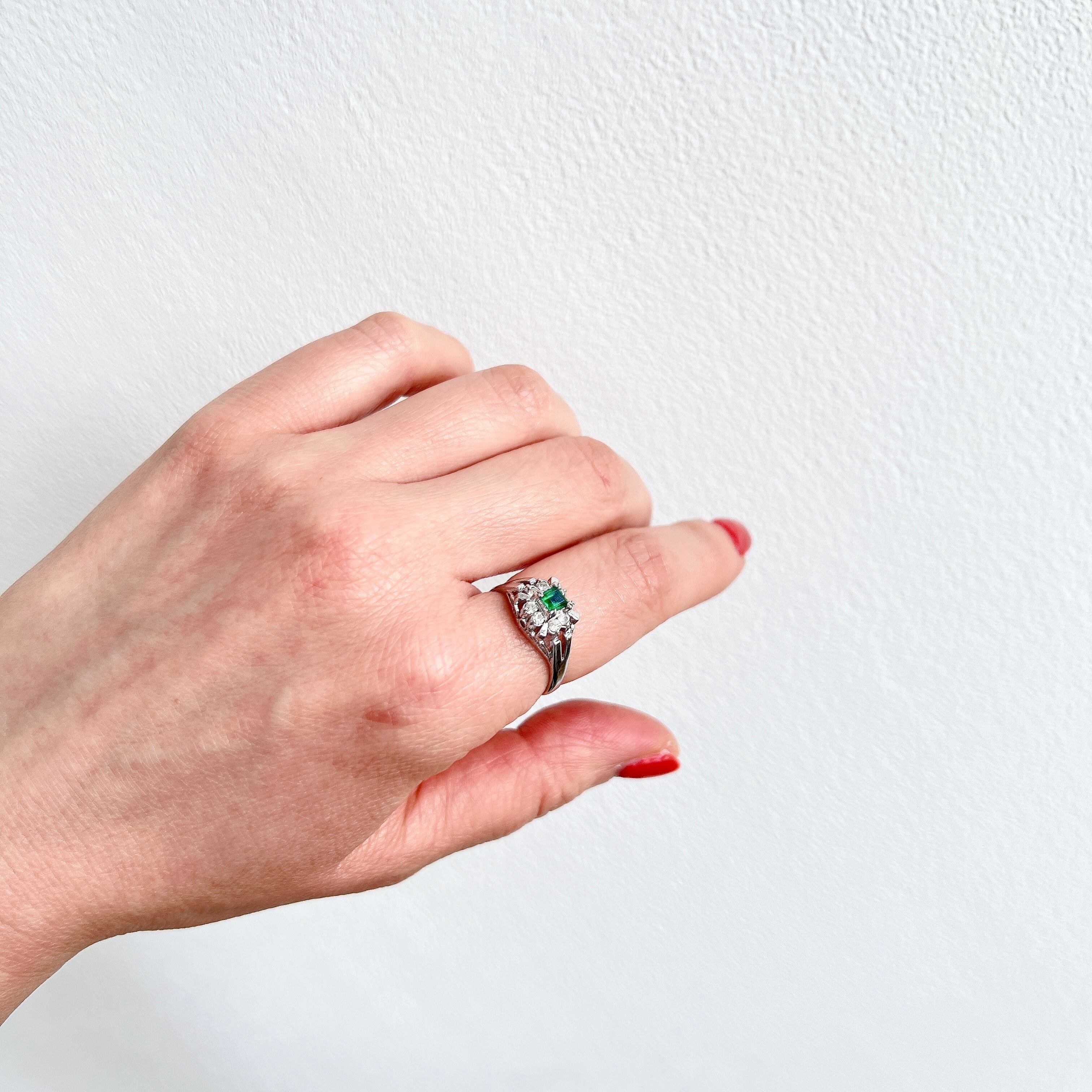 シルバートーンをベースに、グリーンとクリアなラインストーンが煌めく上品なヴィンテージリング。