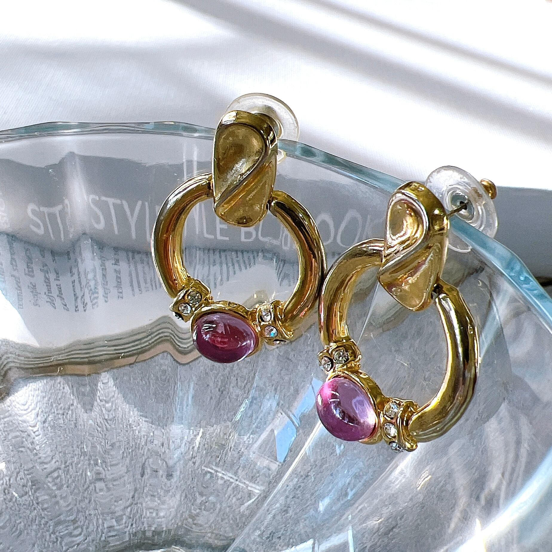 P607-ヴィンテージピアス U.S.A. 1980s Gold Tone Amethyst Cabochon Rhinestone Door Knocker Pierced Earrings | eslup_boutique